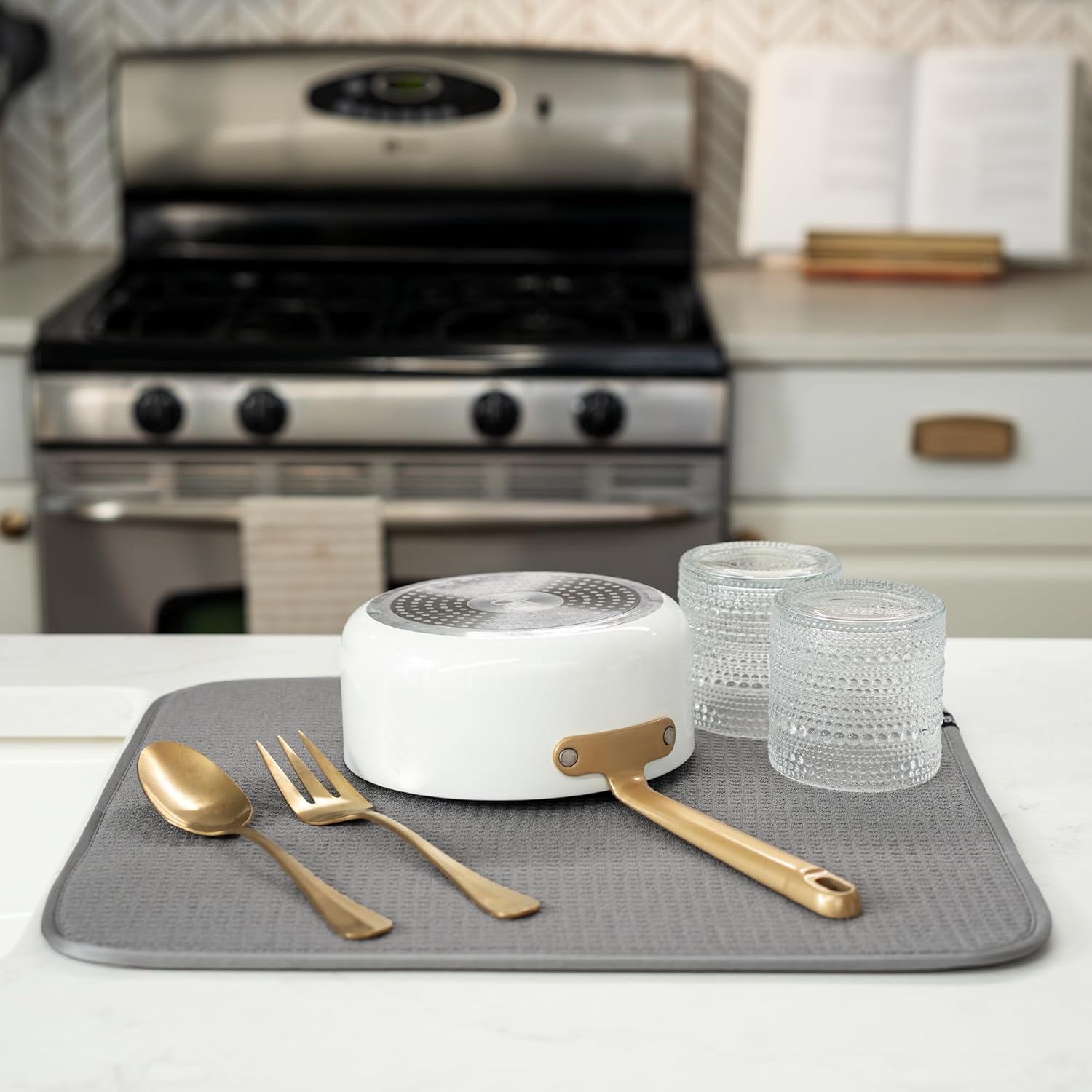 - Catch the kitchen sink drips under a dish drying rack or place your plates, forks, spoons, pots and pans set, or glassware directly on the drying mat