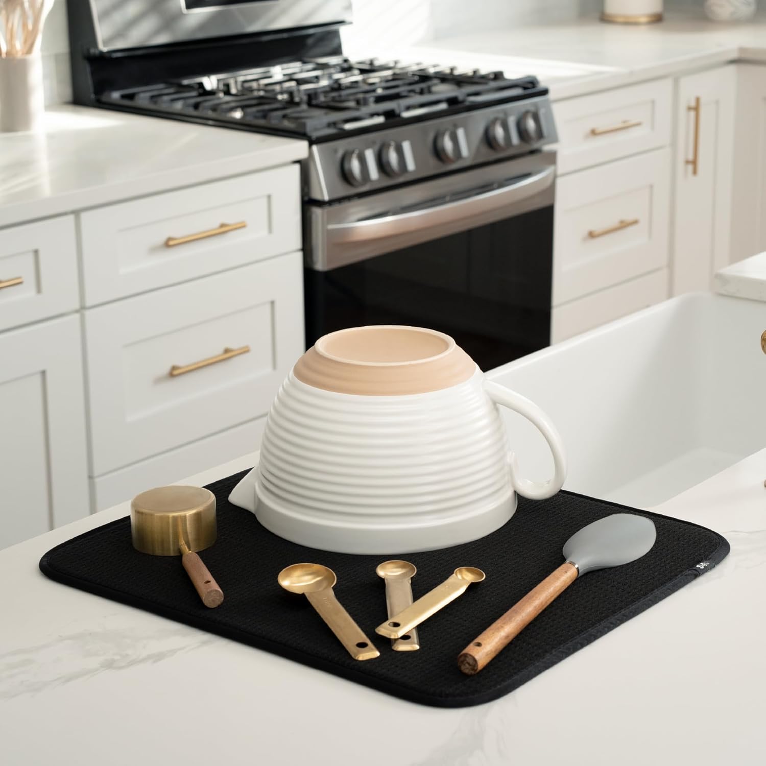 - Catch the kitchen sink drips under a dish drying rack or place your plates, forks, spoons, pots and pans set, or glassware directly on the drying mat