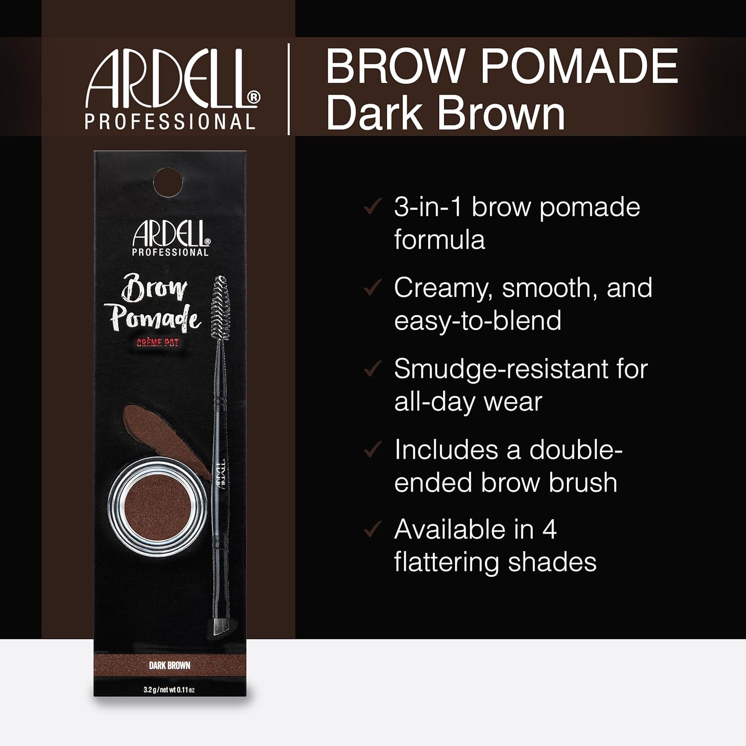 - Ardell Professional Brow Pomade Dark Brown: Buy Ardell Eye Brow Makeup - Sculpt, fill-in and set brows in place all day with just one product; Ardells Brow Pomade combines the work of a pencil, powder and gel into one easy to use pomade; This formula is light, highly pigmented, glides on smooth and blends effortlessly; A little goes a long way and lasts all day;Details provided by Ardell