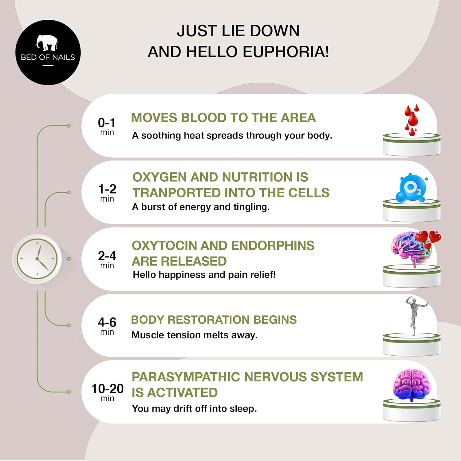 - EASY TO USE: Just lie down on our comfortable accupressure mat for at least 10 minutes and hello euphoria! As trigger points massage your skin, they stimulate oxytocin for calmness and ‘happiness’ endorphins that block pain and ease insomnia or restlessness. The mat is great for travel and can be used for yoga, at the gym, in bed, on the sofa, at home or at the office for head to toe therapy treatment