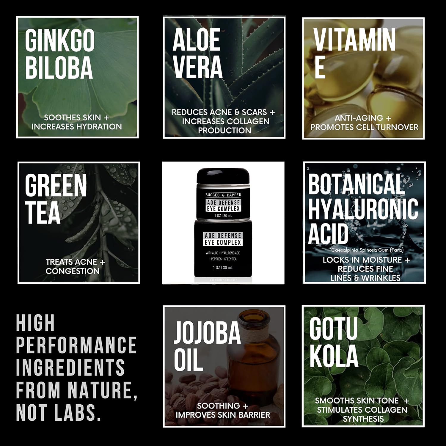 - AGE DEFENSE FOR ALL AGES: Shield your skin from environmental damage with an advanced formula designed to protect against the elements. Ultra-hydrating Hyaluronic Acid & Peptides in this eye cream for men, instantly revives and deeply moisturizes problem areas.