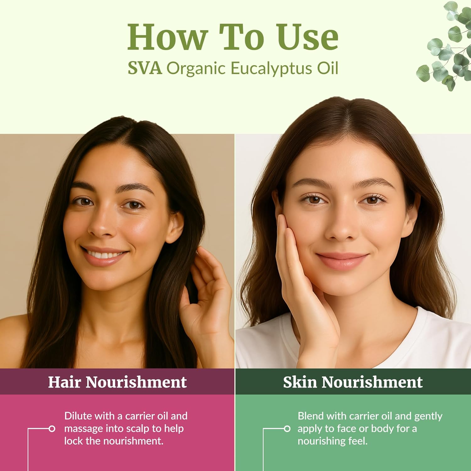 - Hair Care: SVA Eucalyptus Oil is suitable for massage on hair and scalp. Always dilute with suitable carrier oil before use since it is highly concentrated. Dilute a few drops of the oil with suitable carrier oil for massage on the scalp for hair care. You may also use Organic Eucalyptus oil for your scalp and hair by mixing a few drops with your shampoo, conditioner, and mask