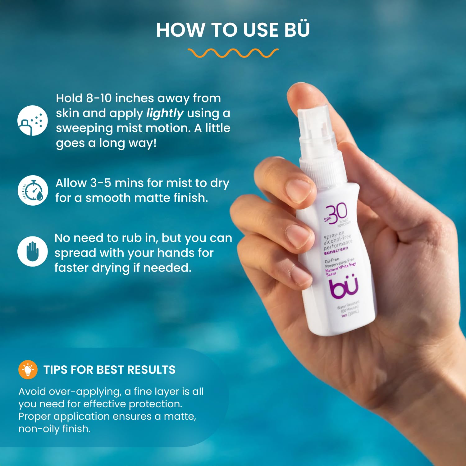 BU SPF 30 Sunscreen Spray for Face and Body, Non Aerosol Spray, TSA Travel Size Sunblock, Clear, Non Greasy, Water Resistant, White Sage 1 oz