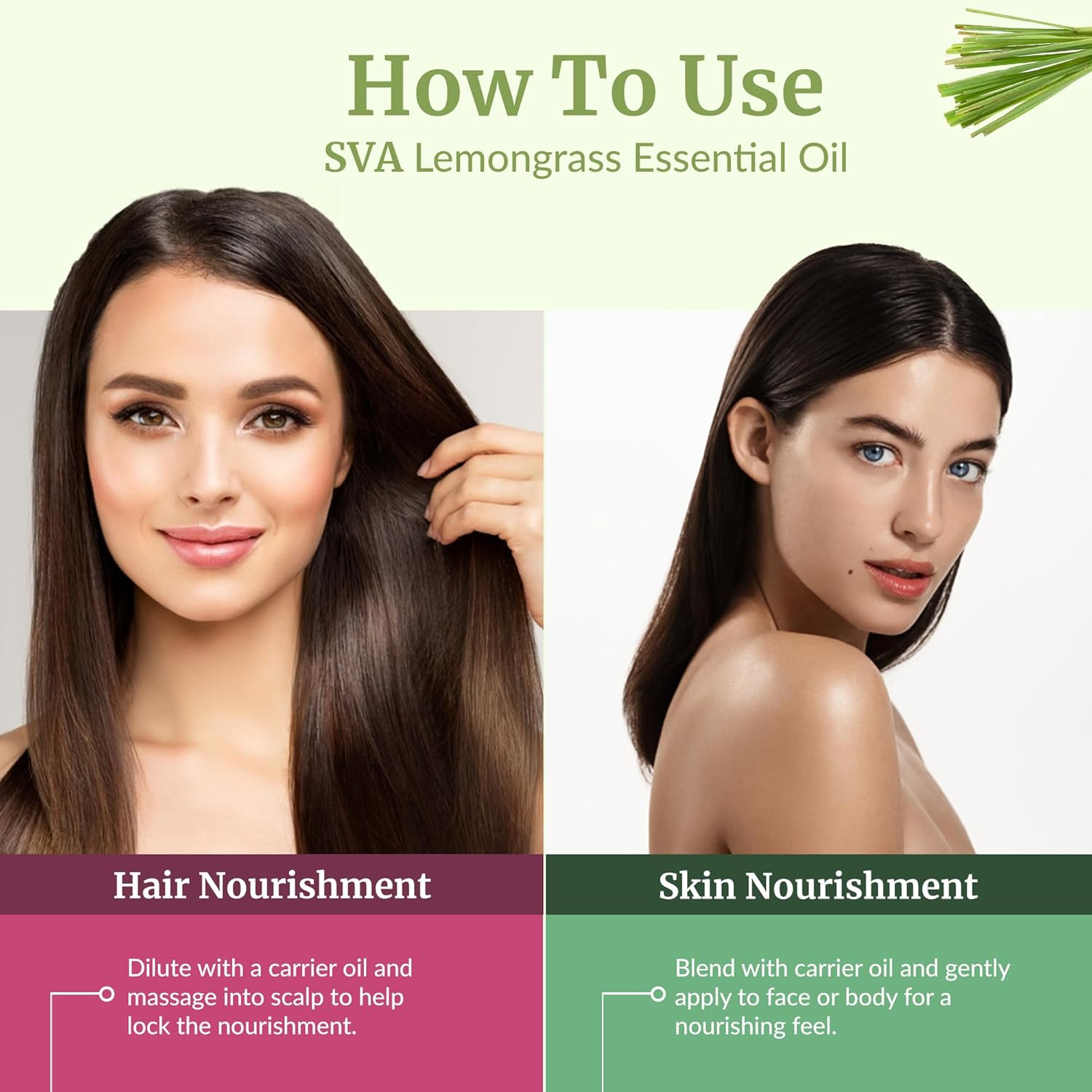 - HAIR CARE: SVA Lemongrass Oil is widely used for hair and scalp massage. Always dilute with suitable carrier oil before use since it is highly concentrated. Simply mix a few drops of lemongrass in shampoo, conditioner, and mask for your hair care routine. Use Lemongrass oil for hair regularly for effective hair care.