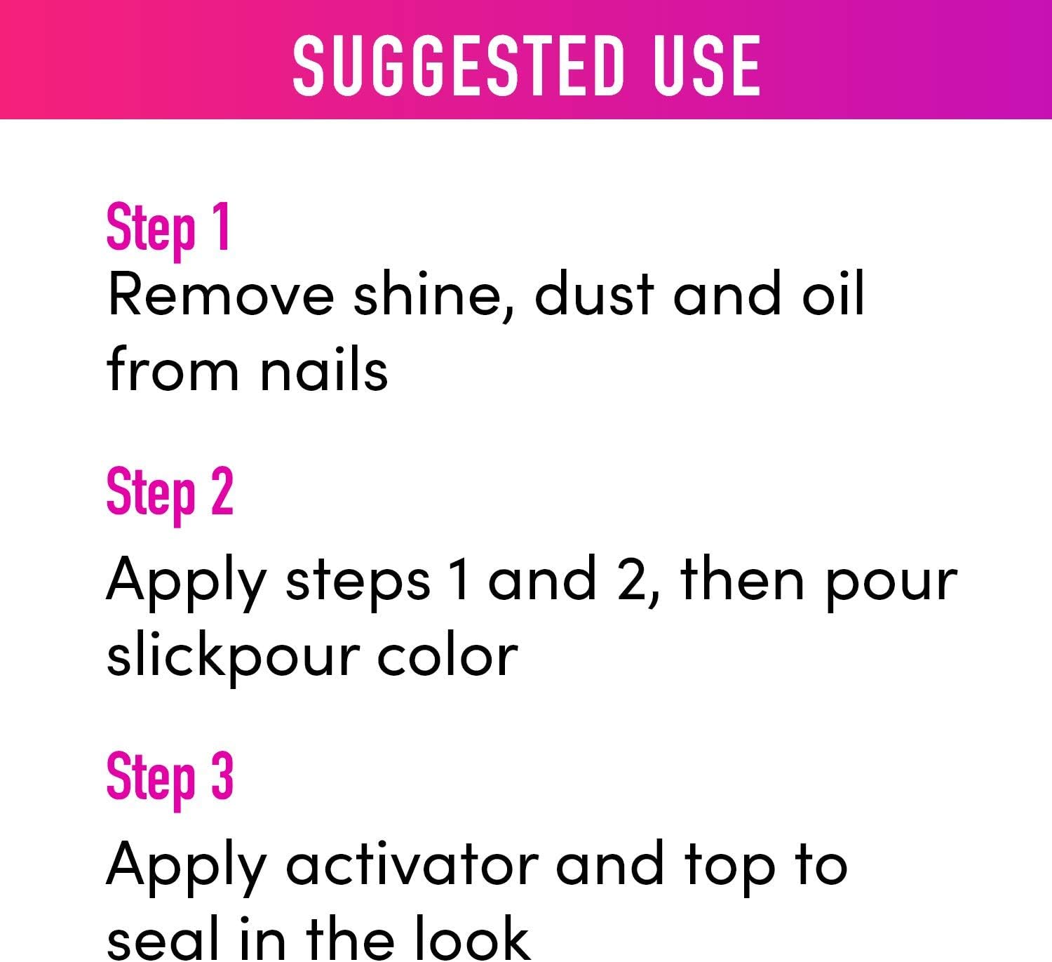 • Four-Step System - The SlickPour System is a four-step process requiring SlickPour prep, base, activator and top coat. Over 80 dip powder colors are available. No UV/LED light needed, as it's an air-dry system.