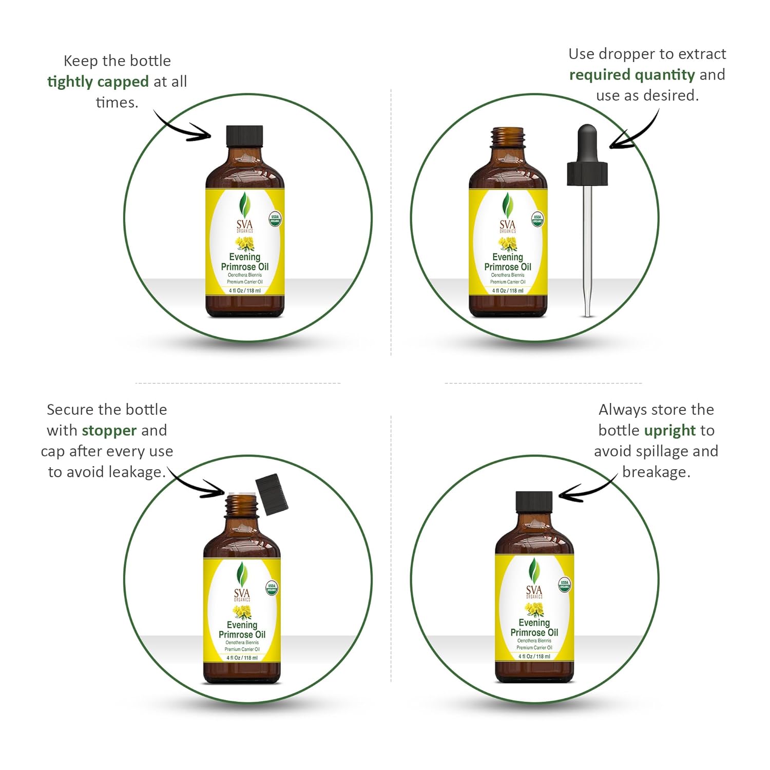 - Premium Quality Organic Evening Primrose Carrier Oil: SVA Organics Evening Primrose Oil is obtained by cold-pressed extraction of Oenothera Biennis plant. Our Organic Evening Primrose oil is free of preservatives and comes with a dropper for easy application. It is not tested on Animals. We care for you!