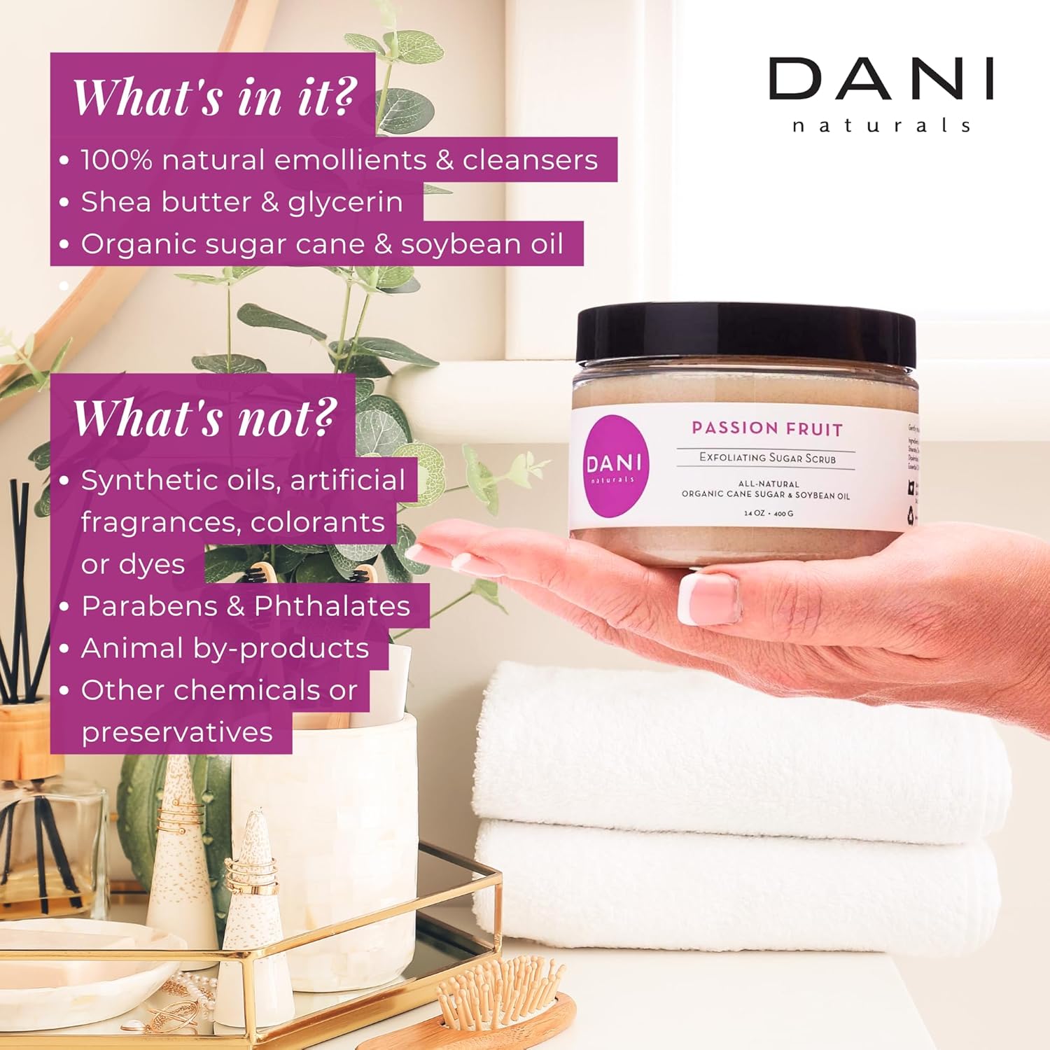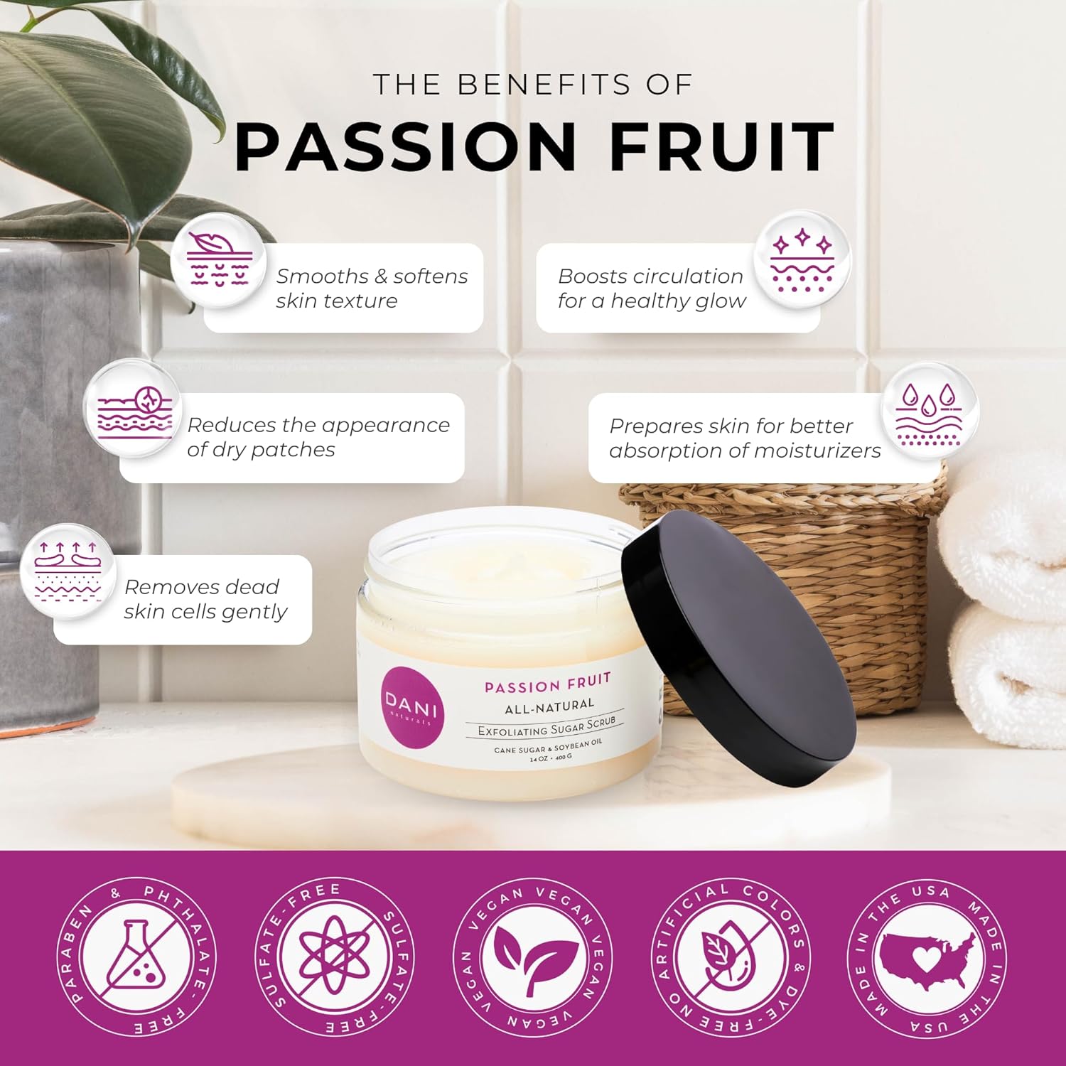 - ● Radiant Skin & Gentle Exfoliation – Organic cane sugar exfoliates to reveal smoother, softer skin. Perfect for face & body, leaving skin refreshed with Passion Fruit