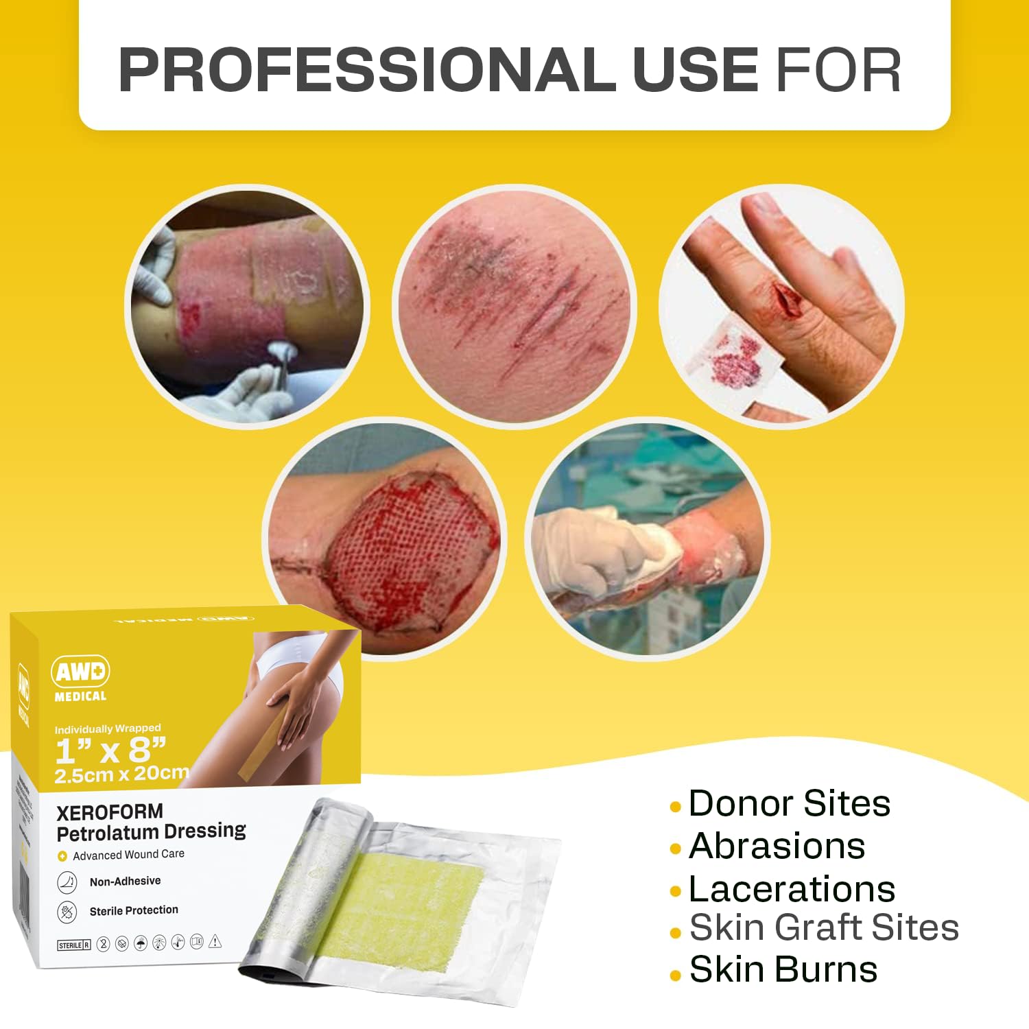AWD Medical Xeroform Petrolatum Dressing - Non-Adhering Gauze Pad - Fine Mesh Gauze Patch Sterile - Healthcare Supplies for Wound Care, Burns, Lacerations, & Skin Grafts Aide (Box of 50) (1"x8")