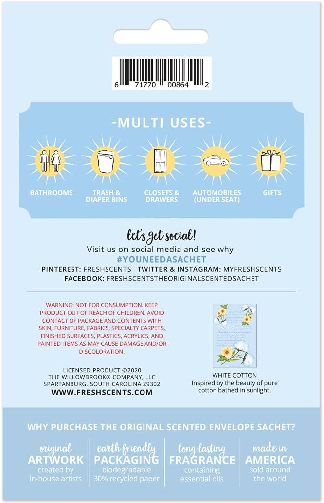 WILLOWBROOK | Fresh Scents Scented Sachet Packet | White Cotton | Air Freshener Bags for Drawers, Closets, Cars | 6 Pack | Long Lasting Home Fragrance