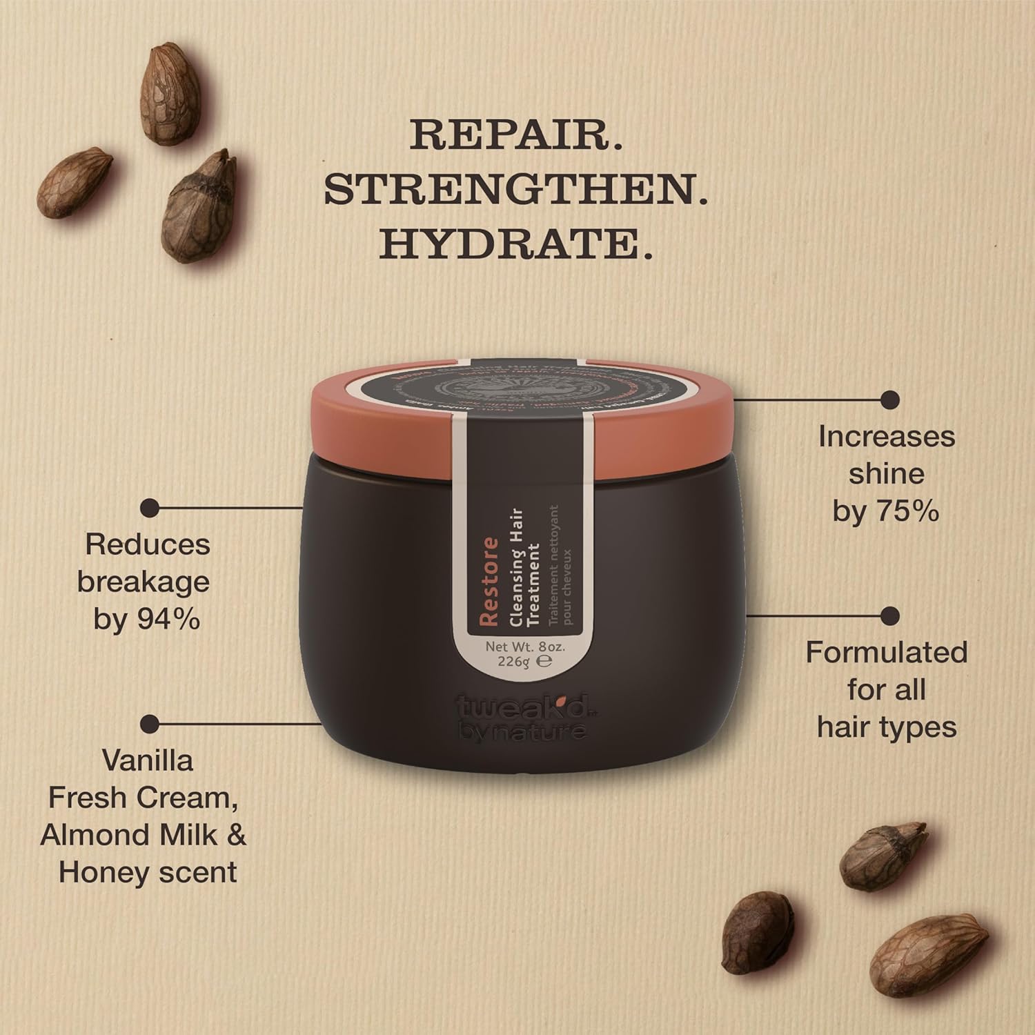 Tweak’d by Nature - Restore Cleansing Damaged Hair Treatment, Sulfate Free Conditioner for Damaged Dry Hair, Shampoo, Detangler, and Intensive Hydrating Solution and Shine Serum (8oz)