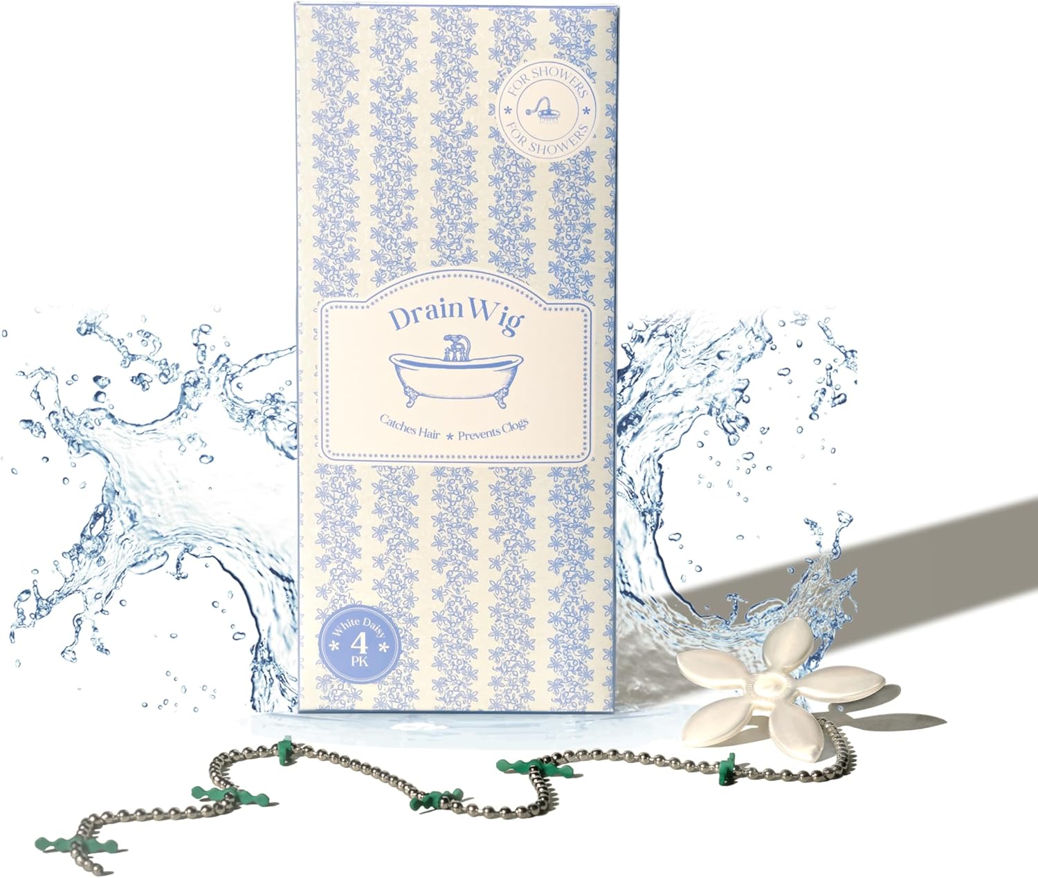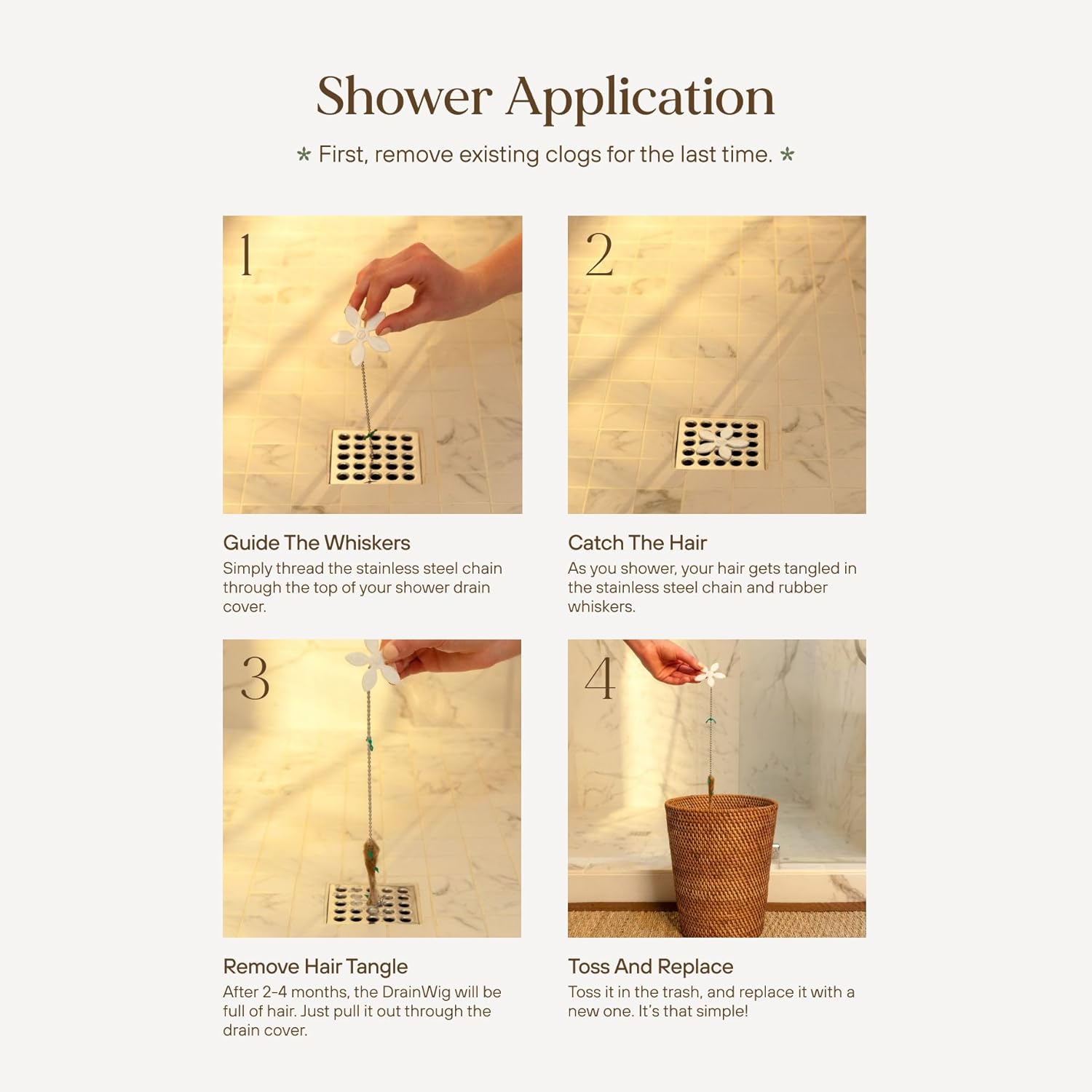 DrainWig Shower Drain Hair Catcher – Disposable White Flower (4-Pack) – No-Touch Hair Removal for Flat Shower Drains – As Seen on Shark Tank
