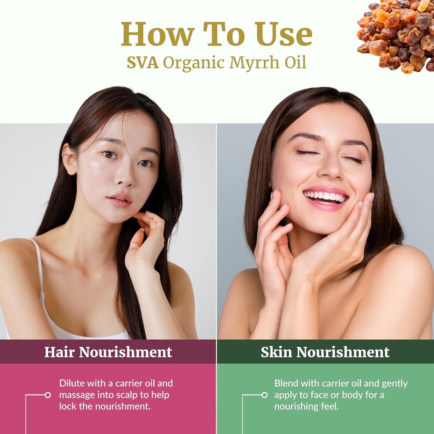 - Skin Nourishment: SVA Organic Myrrh Oil is suitable for massage. It should always be diluted with suitable carrier oil before use since it is highly concentrated. There are many ways to use Myrrh essential oil for the skin. Add a few drops of the oil to your creams, lotions, or bath products to enjoy the goodness of Myrrh oil for your skin.