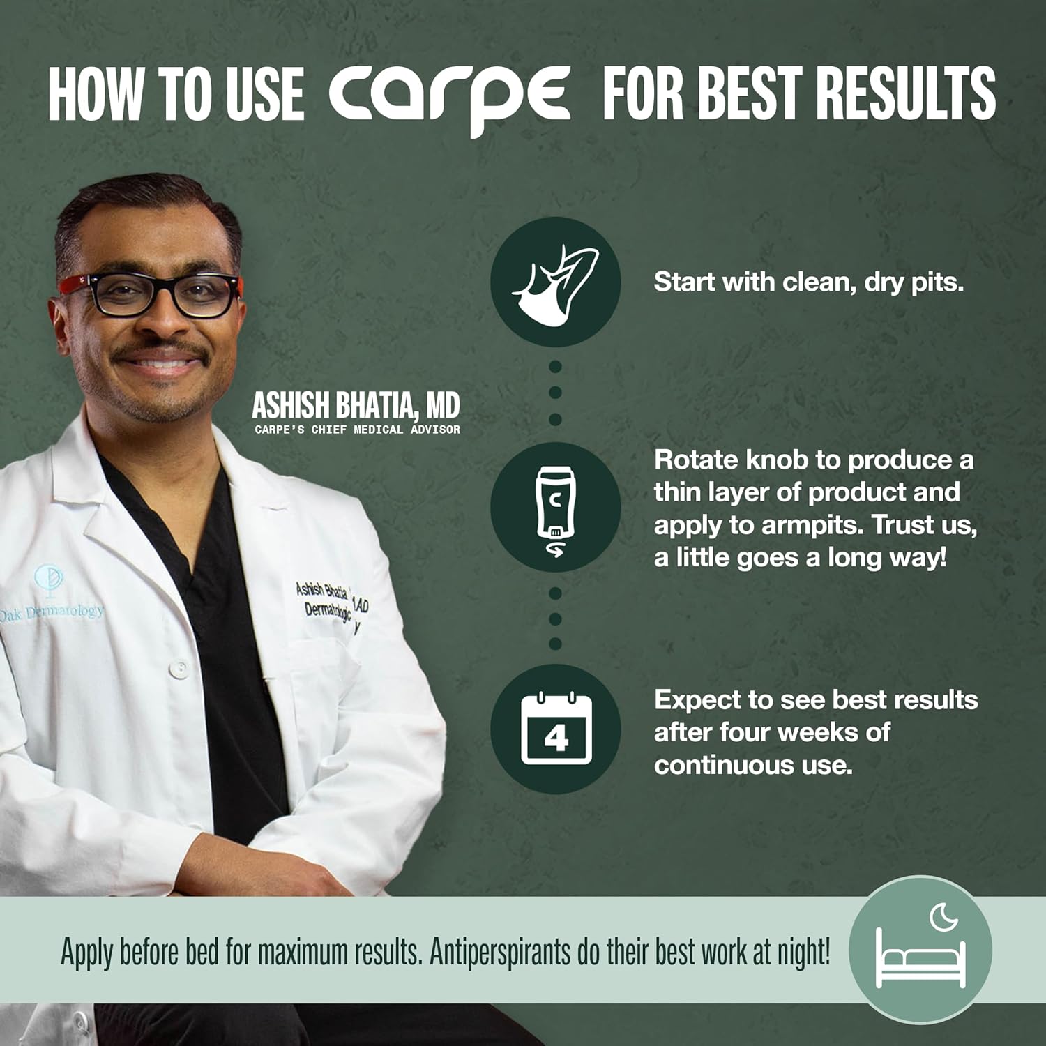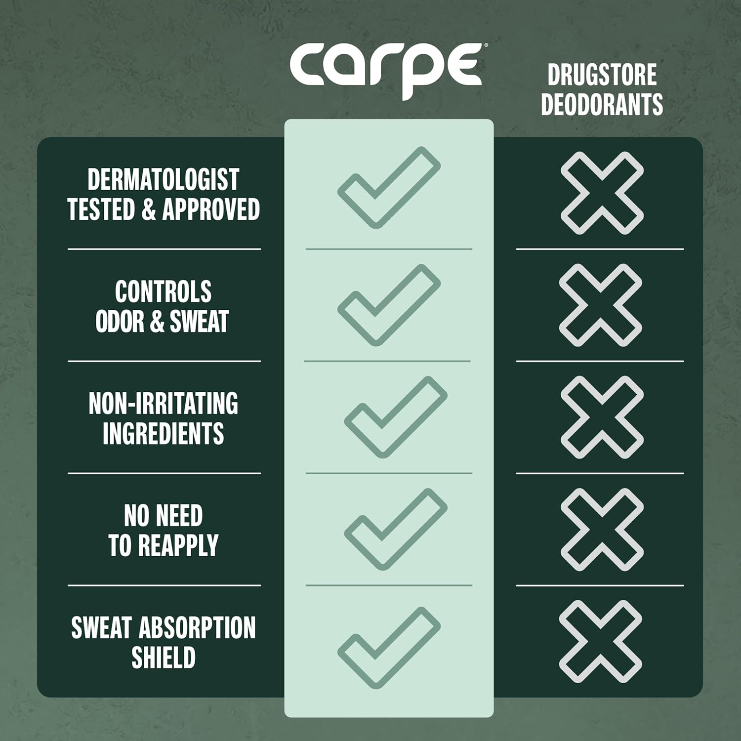 - DEVELOPED WITH DERMATOLOGISTS: Carpe’s scientifically developed formula has been independently tested for safety and proven to be a leading over-the-counter sweat treatment.