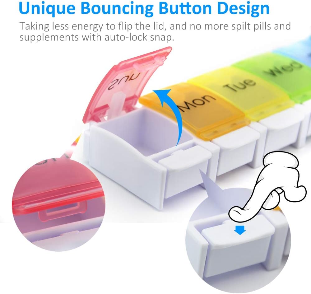 - Convenient and Secure: Our pill organizer is made of BPA-FREE food grade plastic, odorless and safe for medical use. Pop-up open design is very friendly for elderly or arthritis patient. Each snap-shut lid can securely locks, no pills will spill out