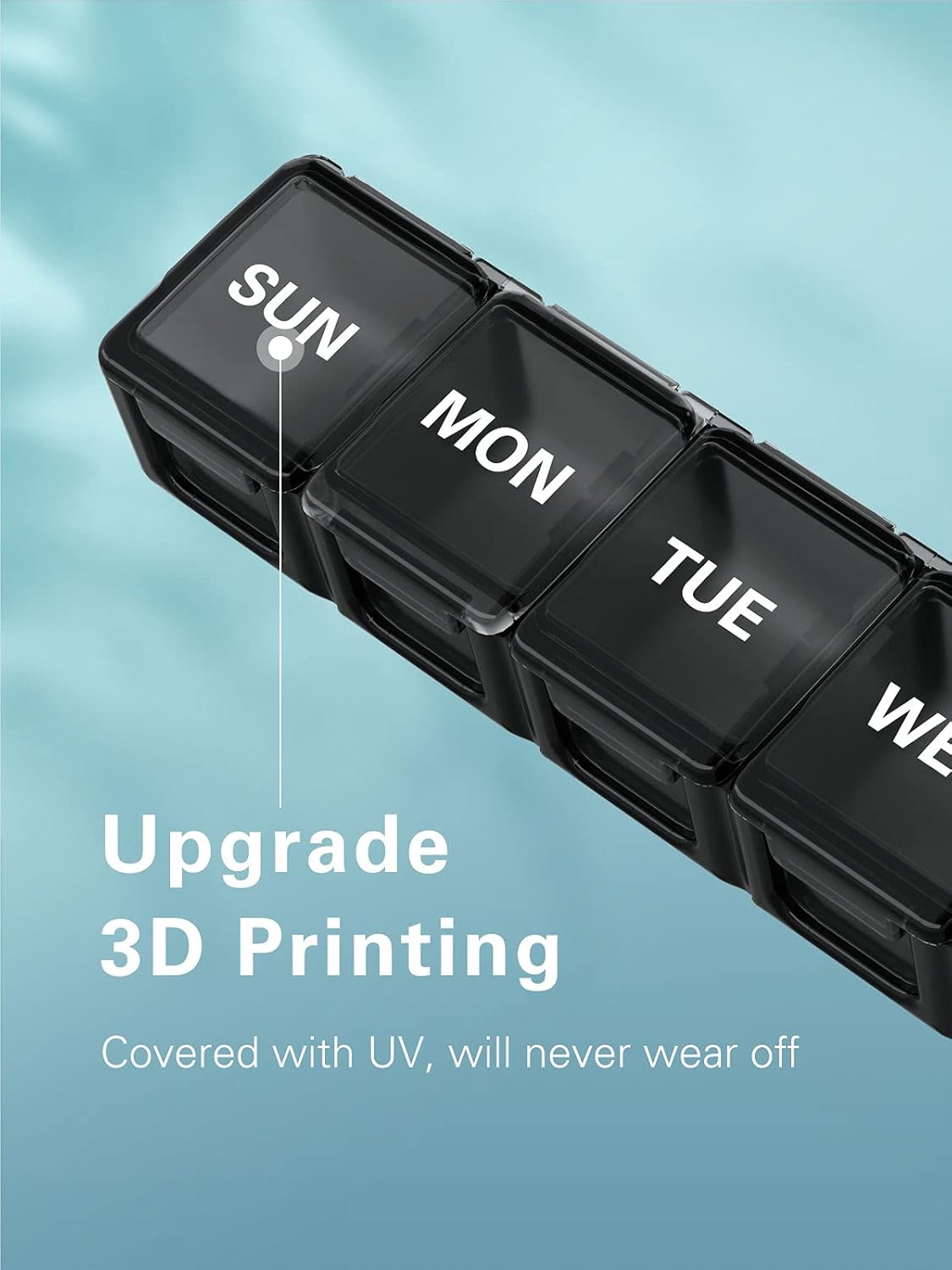 - Long-Lasting Printing: This 7-day pill box features bold marks for the week, making it simple to track your pills without needing to remember. The upgraded printing ensures that these marks remain durable, lasting up to 10,000 uses without showing any wear and tear.