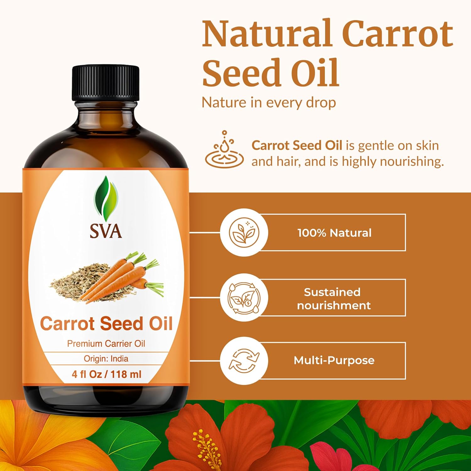 - PREMIUM QUALITY CARROT SEED CARRIER OIL: SVA Carrot Seed Oil is obtained by cold pressed extraction of Daucus Carota seeds. Our Carrot Seed oil is free of preservatives and comes with a dropper for easy application. It is not tested on Animals. We care for you!