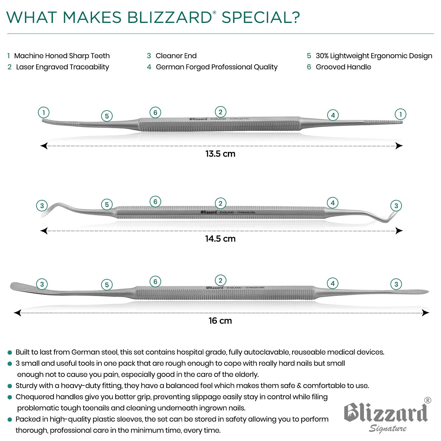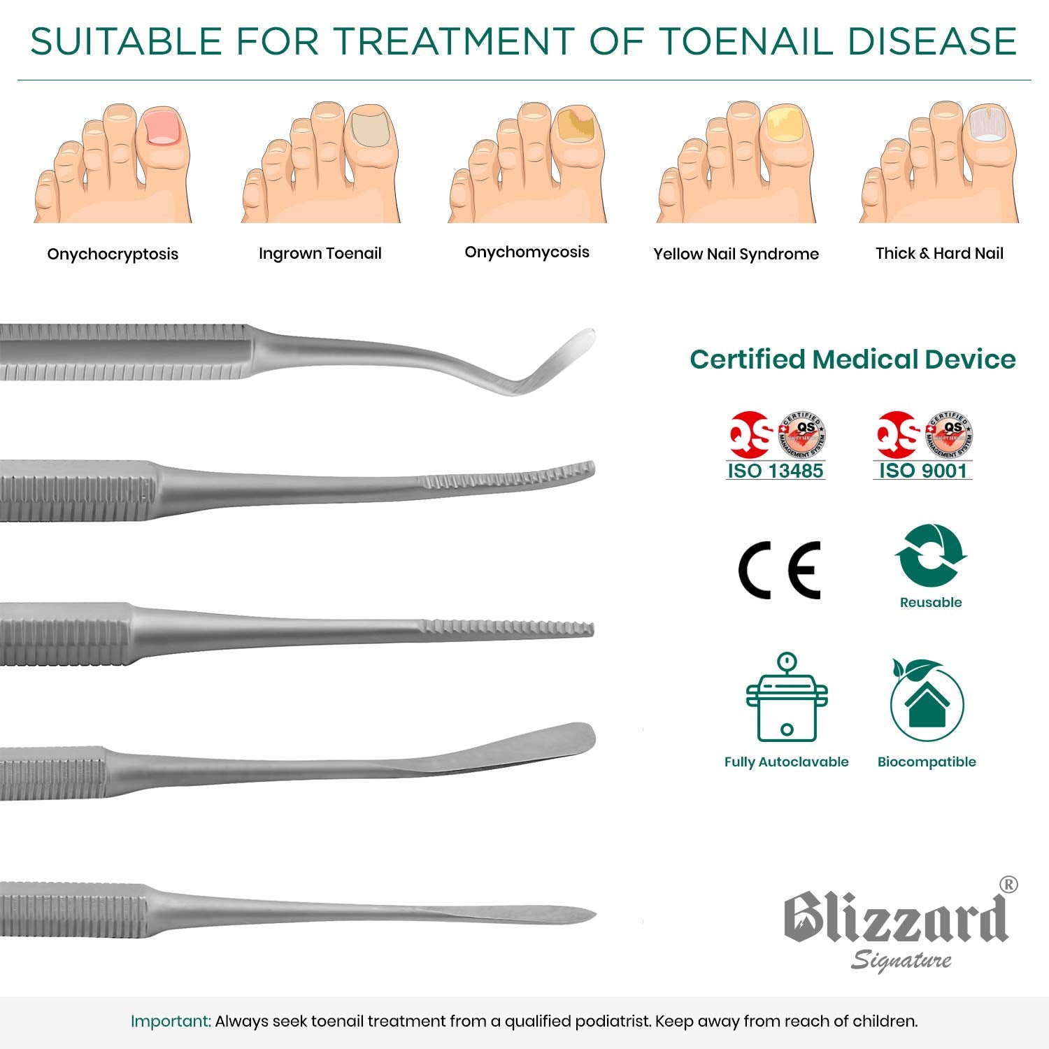- 3-piece ingrown toenail kit includes 1 x double ended nail cleaner, 1 x double-ended blacks file and 1 x double-ended nail lifter. Hospital grade medical device: our reusable, fully autoclavable ingrown toenail set is built from premium German steel to the highest quality standards; ISO 13485, ISO 9001 and CE certified.