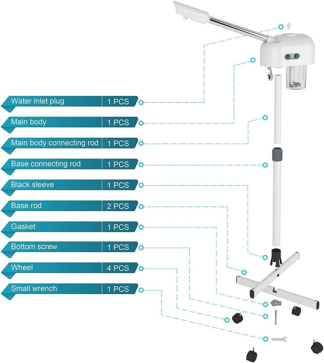 - ★ EXQUISITE WORKMANSHIP : Titanium atomizing disc, more foggy, more fine, can extend spraying time. High quality SS pipe, sturdy and durable, no rust. Thicker high capacity water cup, can store 600ml water. The head of the machine is free to rotate 360°. Adjustable height from 38.1" - 46.4". Easy moving with universal wheels.