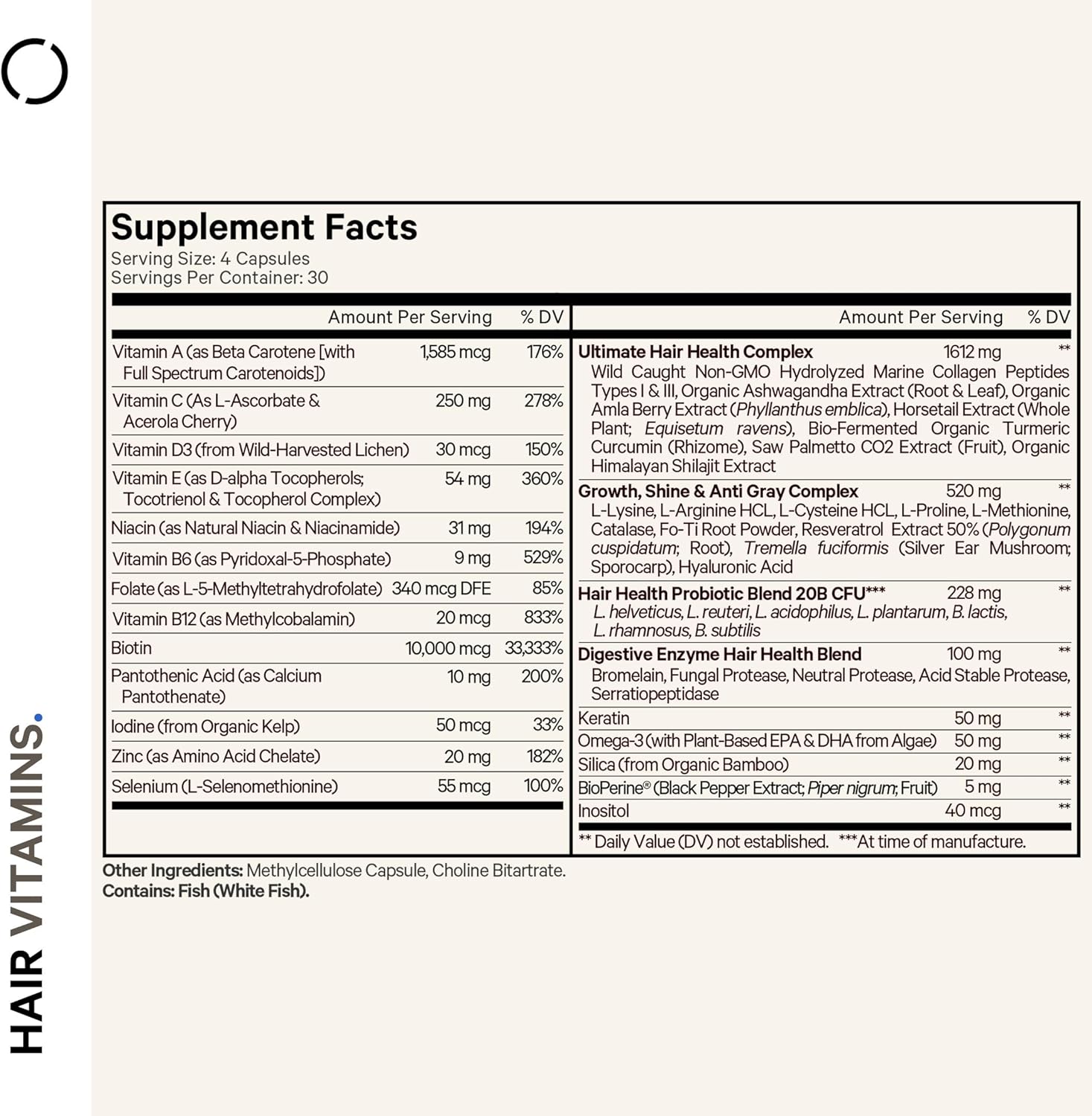 - Comprehensive Hair Nutrient Blend: Codeage Hair Vitamins supplement features 10,000 mcg of biotin, hydrolyzed wild-caught marine collagen types I and III, keratin, and essential vitamins A, B6, B12, C, D3, and E—all in one formula to complement your hair care routine. It also includes omega-3 with plant-based EPA and DHA.