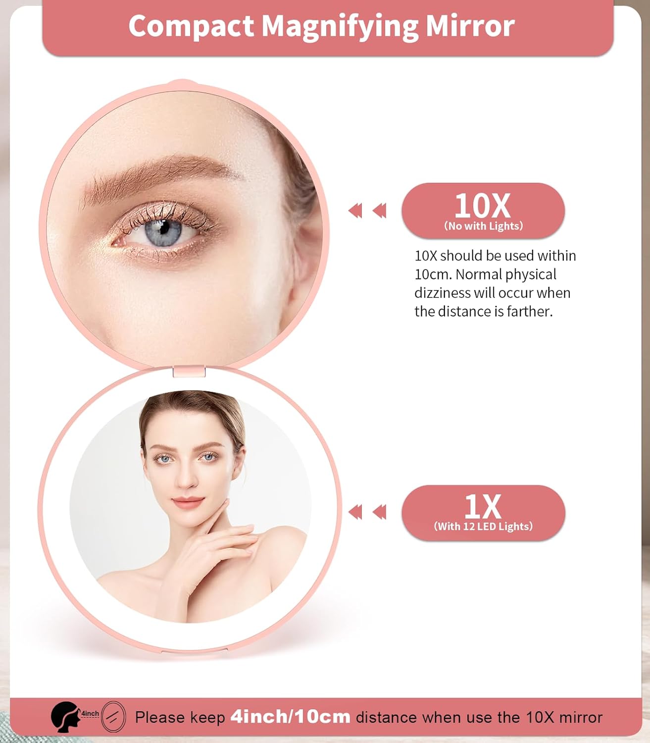 - 【10X Magnifying Mirror】The 1X mirror equipped with 10 daylight LEDs,It can show your face more clearly, even in dim environment, with the help of LED lights,you can better finish your makeup ! 10X magnification is great for close up detail work such as applying eye makeup.