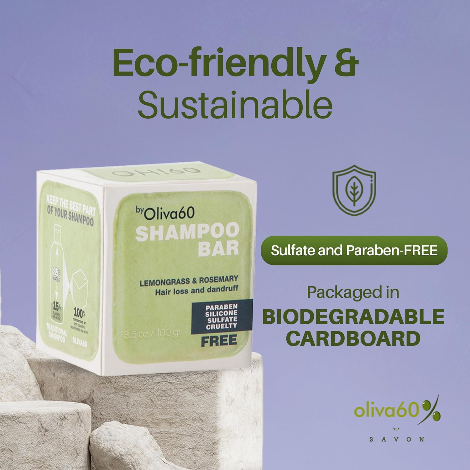 Shampoo Bar Lemongrass Rosemary - Olive, Argan, Macadamia Oil | Sulfate & Paraben Free | Organic Natural Hair Care | 3.5 oz | Shampoo for Oily Hair | No Plastic Waste | OLIVA 60