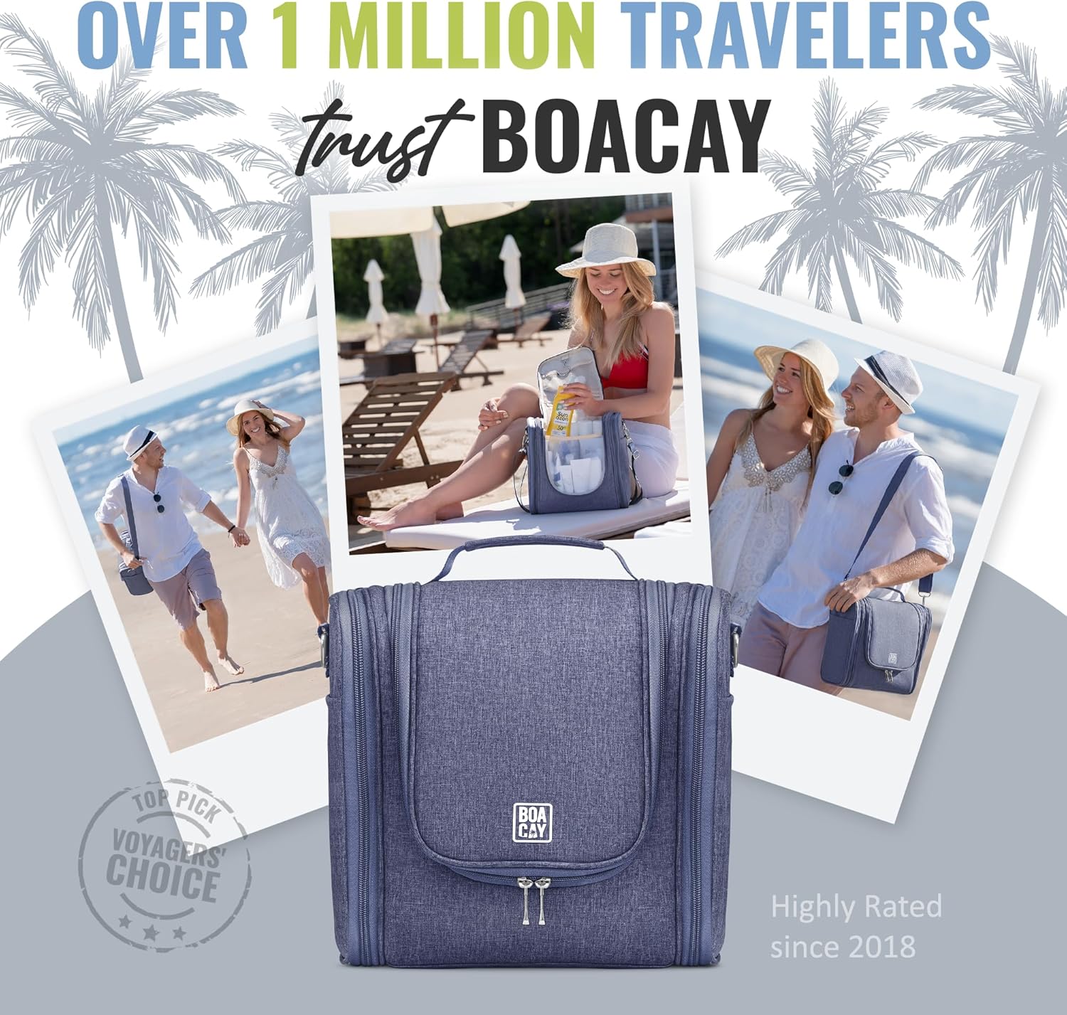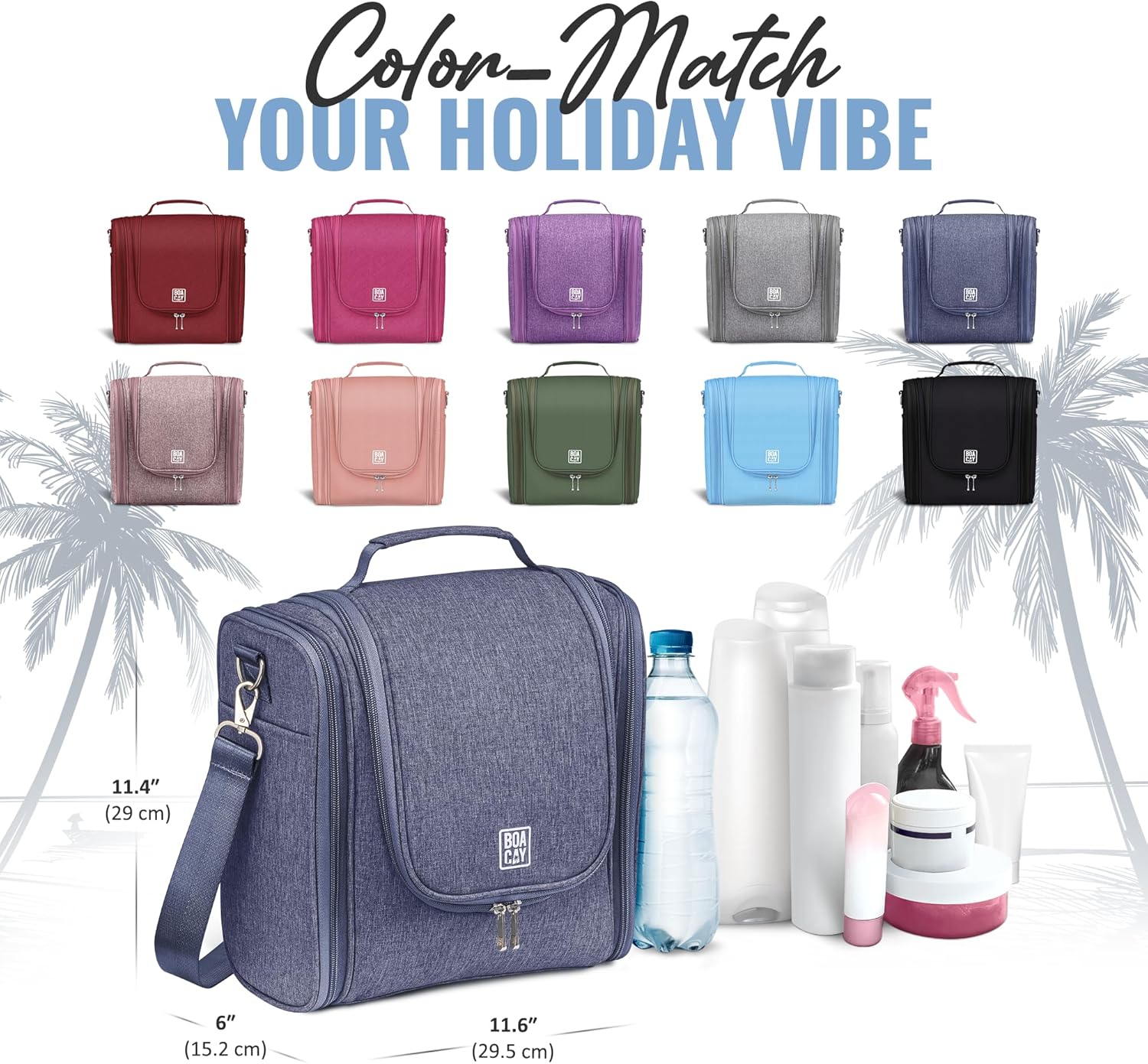 - If you want a large makeup bag, a cosmetic, or an accessories organizer, Boacay toiletry bag is for you. It is multifunctional, has metal zipper pulls, and it’s made of only high-quality materials.