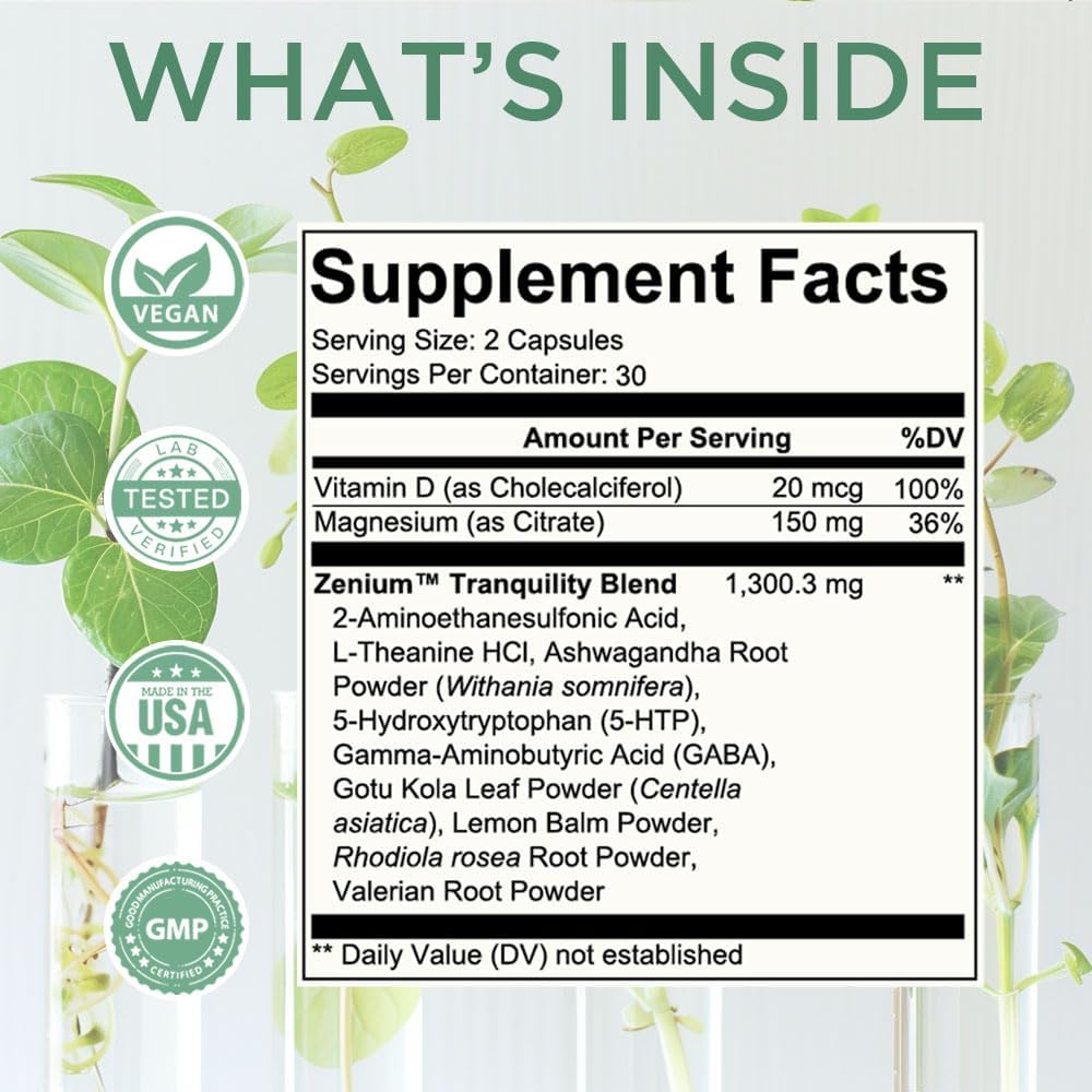 Zenium - Relieve Stress, Tension, Worry, Nervousness, & Irritability | Calm The Mind & Body | Ayurvedic | Natural Relief Supplement | Boosts Mood | Ashwagandha, L-Theanine, GABA, Rhodiola |60 Capsules