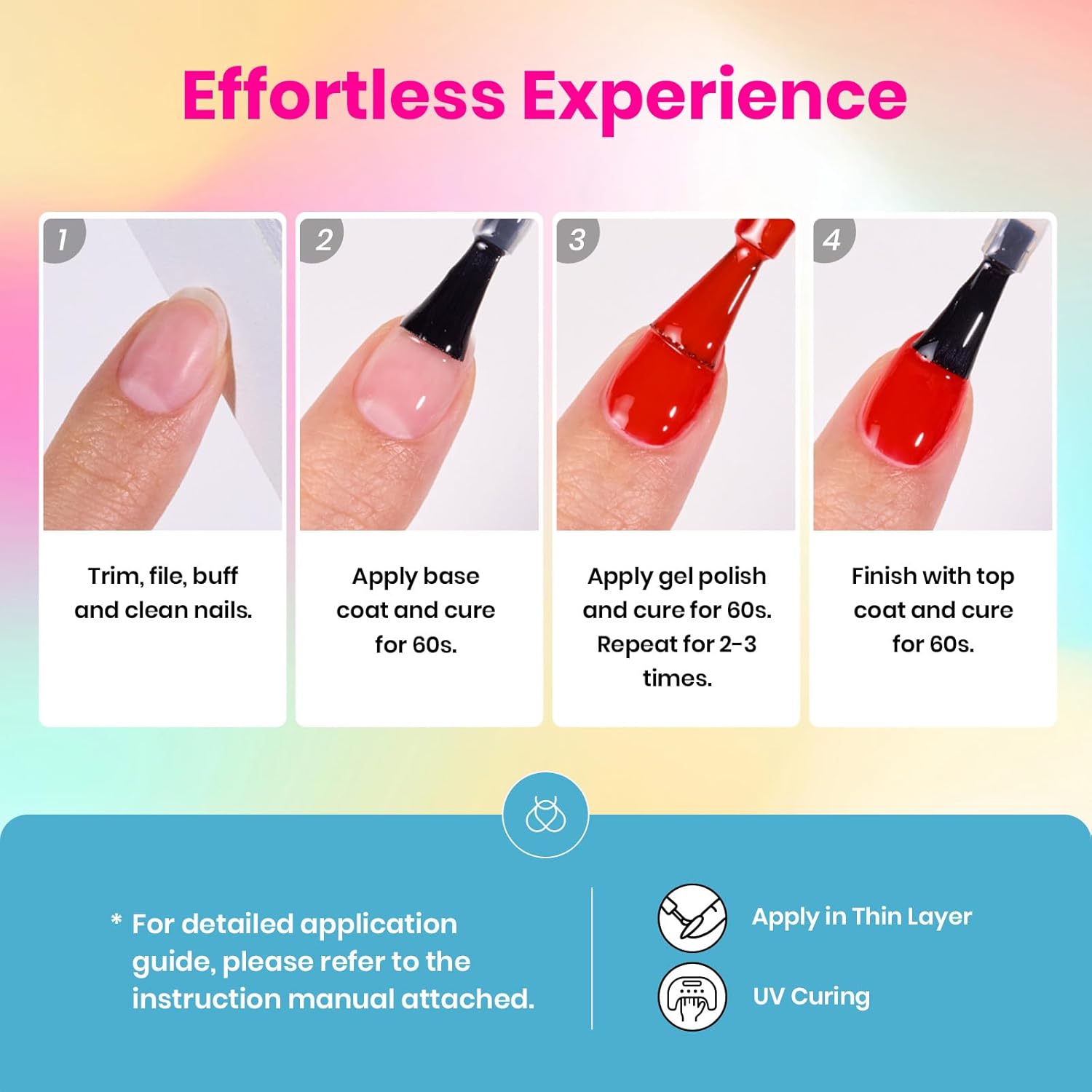 - UV/LED Soak Off Gel Polish: Works with all UV and LED nail lamps. Simply cure each coat for 60–90 seconds for a long-lasting, glossy finish.
