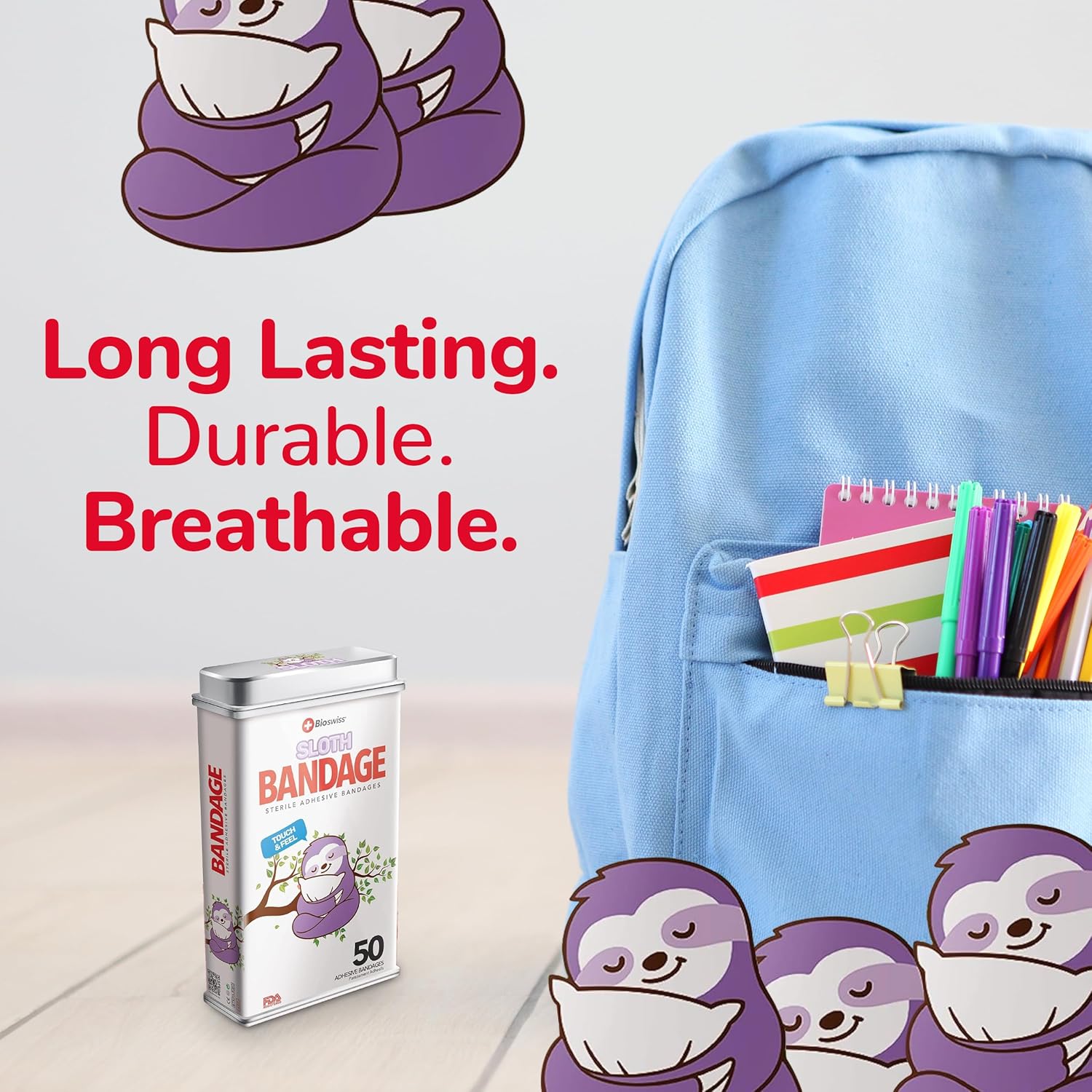 - 50 SLOTH KIDS BANDAGES: Fun sloth-shaped adhesive bandages tin helps protect cuts, scrapes, and minor wounds while making healing less stressful for children