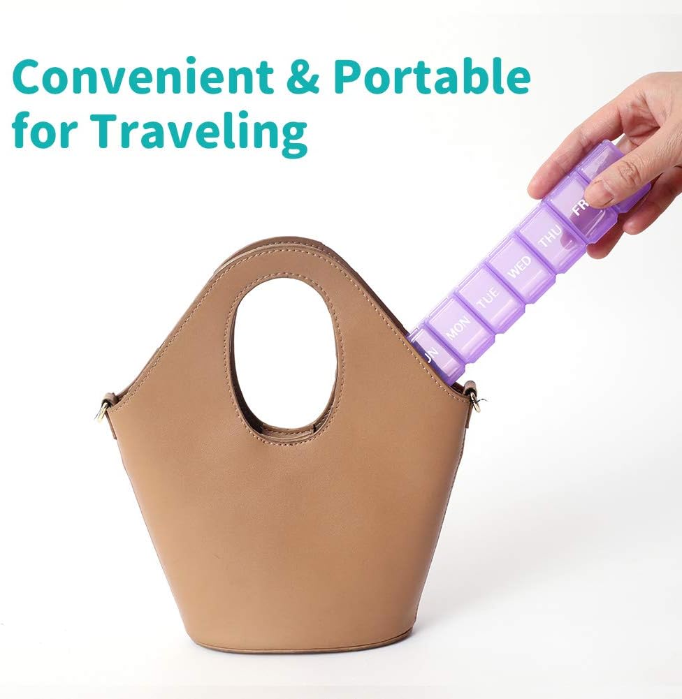 2 Packs Small Weekly Pill Organizer,Pocket Daily Pill Case Pill Box for Pills/Vitamin/Fish Oil/Supplements (Purple)