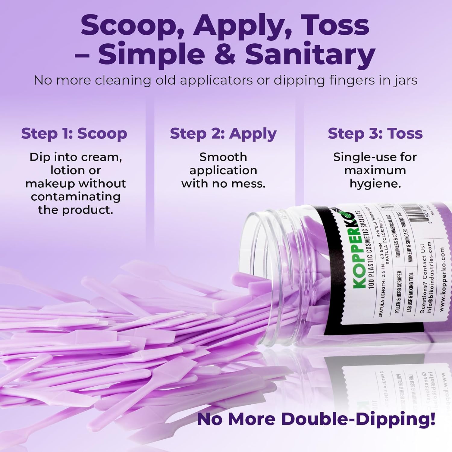 - Clean Out Your Containers: Maximize product use with our 100 pack of 0.25"x2.5" disposable cosmetic plastic spatulas. Easily extract creams, lotions, or makeup from containers, even in tight spaces, without getting product under your nails