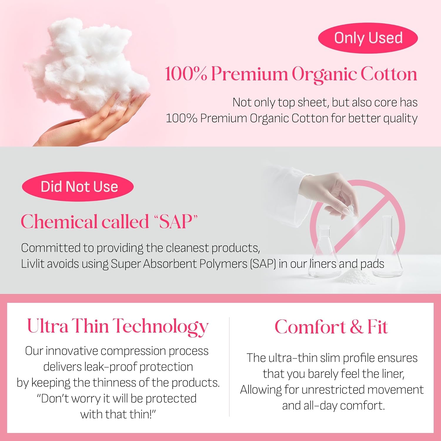 - PREMIUM ABSORBENCY: Elevate your period experience with Livlit organic pads and liners. Discover reliable, organic protection without compromising on performance. Exceptional absorbency for peace of mind.