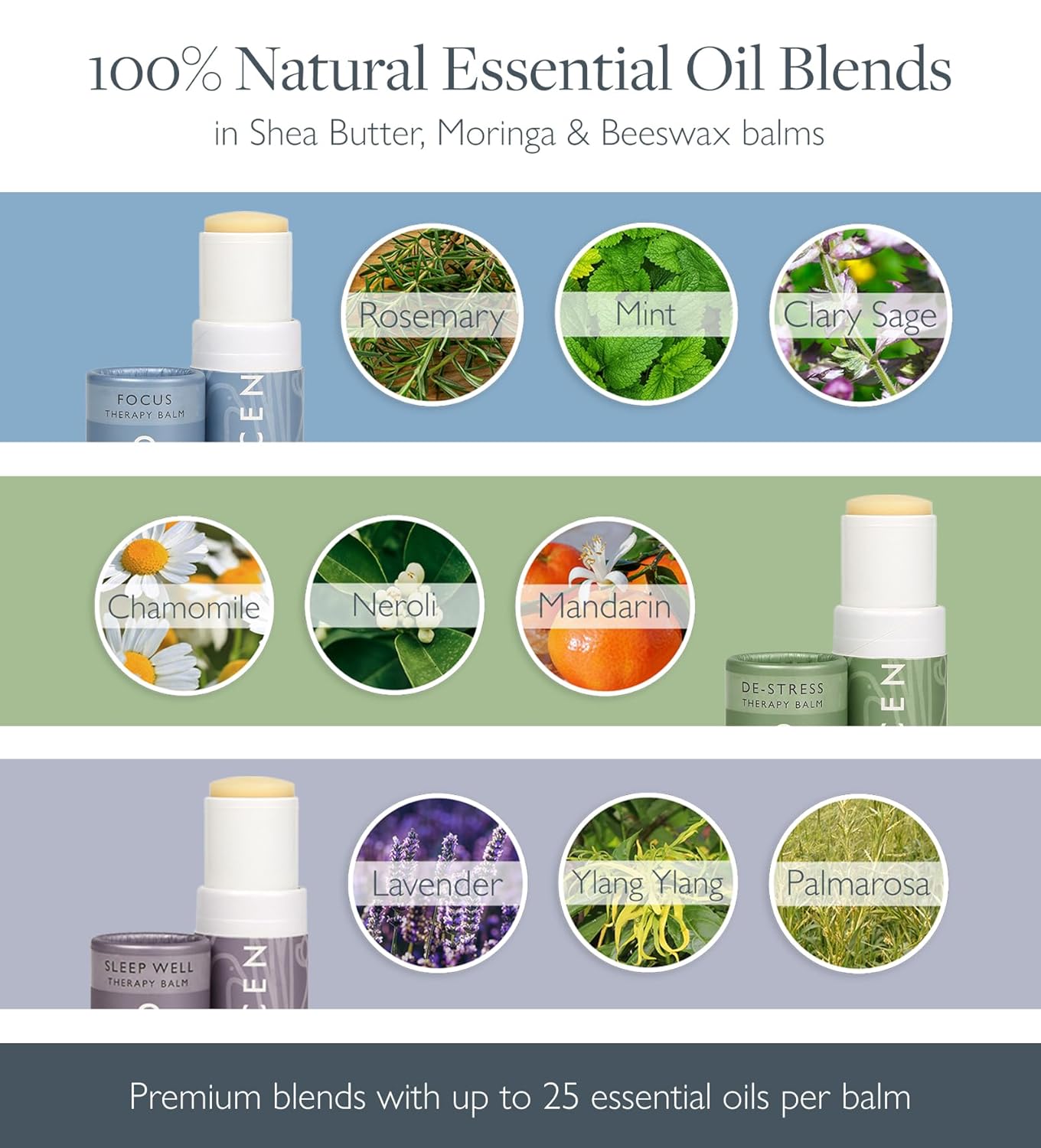 - Premium Essential Oil Blends: 100% Natural – 'Sleep Well' combines Lavender, Ylang Ylang, and Palmarosa as a natural sleep balm, 'De-Stress' blends Chamomile, Neroli, and Mandarin for anti-stress support, and 'Focus' features Rosemary, Mint, and Clary Sage for enhanced concentration. All balms are in a Shea Butter and beeswax base. Cruelty free and vegetarian-friendly.