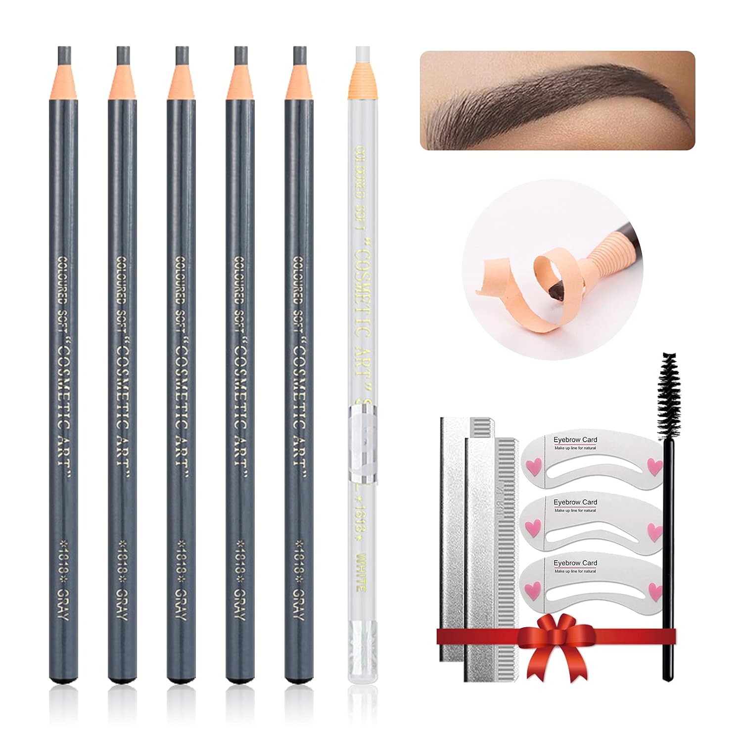 - 【Package Includes】 You will get: 5 Peel-off Eyebrow Pencil, 1 White Eyeliner Pencil, 2 Eyebrow Trimming Blade (Sharpeners), 3 Eyebrow Stencils, 1 Eyebrow Brush (Spoolie).