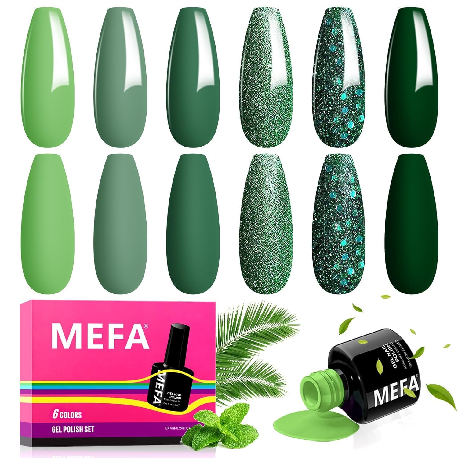 - Green Gel Nail Polish: MEFA 6 colors gel nail polish set, 7ml each bottle premium gel polish colors. The set features a stunning array of green shades, including sage green, lime green, deep green, and sparkling green glitter