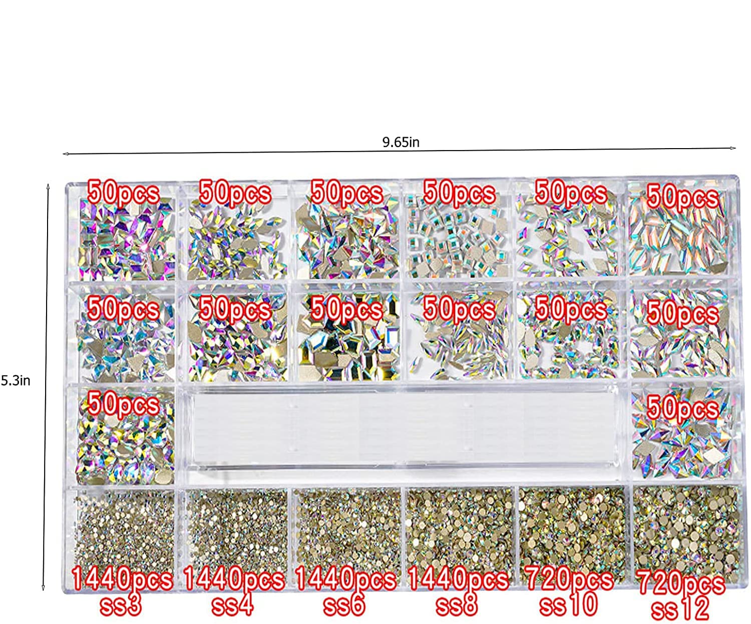 - 💎【Nail Crystal Rhinestones Kit】:Professional AB rhinestones for nails, total of 7900 nail diamonds gold-bottom AB diamonds,includes 14 types of 50 large diamonds, 4 types of 1440 diamonds, and 2 types of 720 diamonds. It is a very personalized and fashionable handicraft with rhinestones.