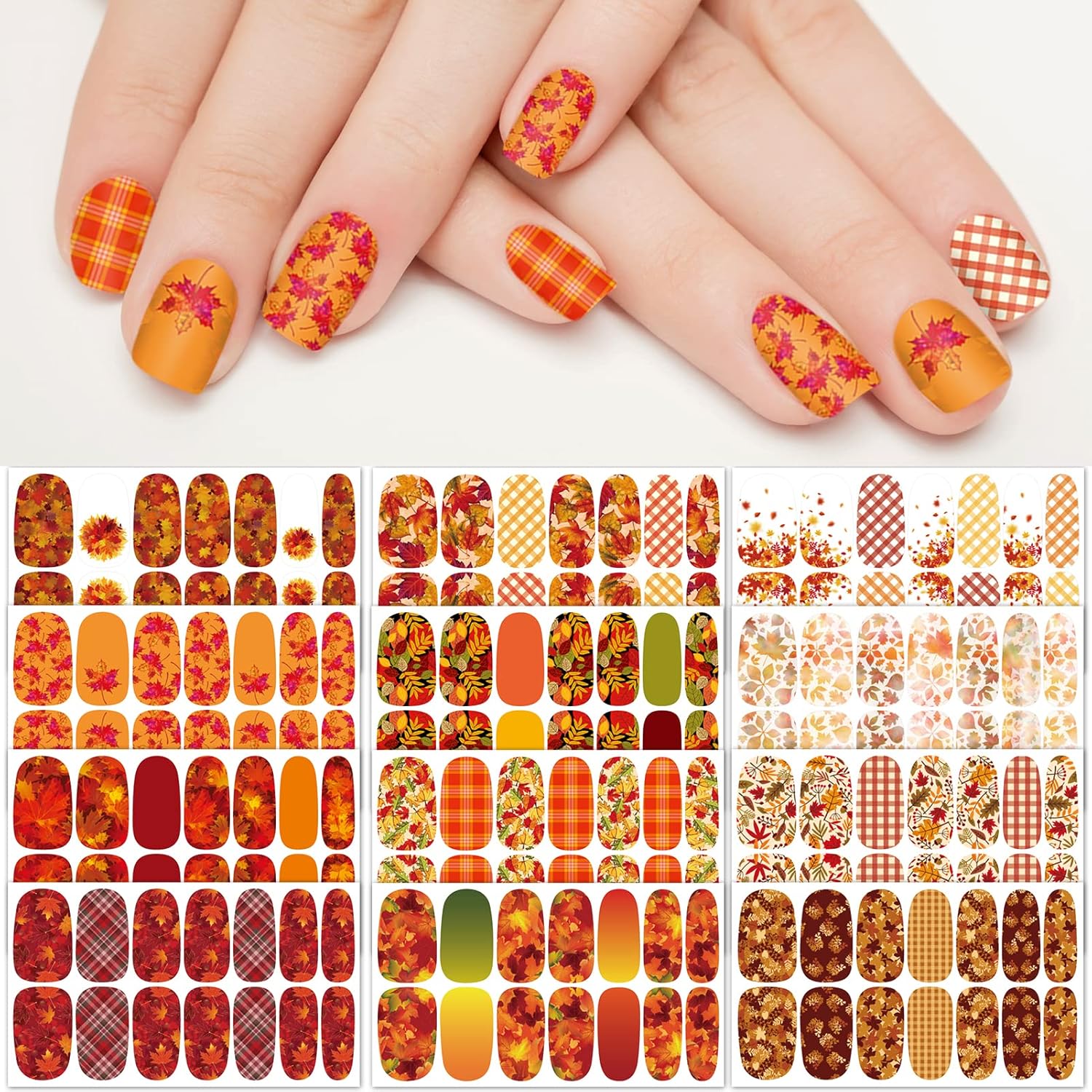 - 12 Sets of fall themes: You will receive 12 sheets of autumn full wraps and 2 pcs nail files in different designs. Autumn colors and grid shapes make your nails full of festive atmosphere, which can meet your everyday matching needs.