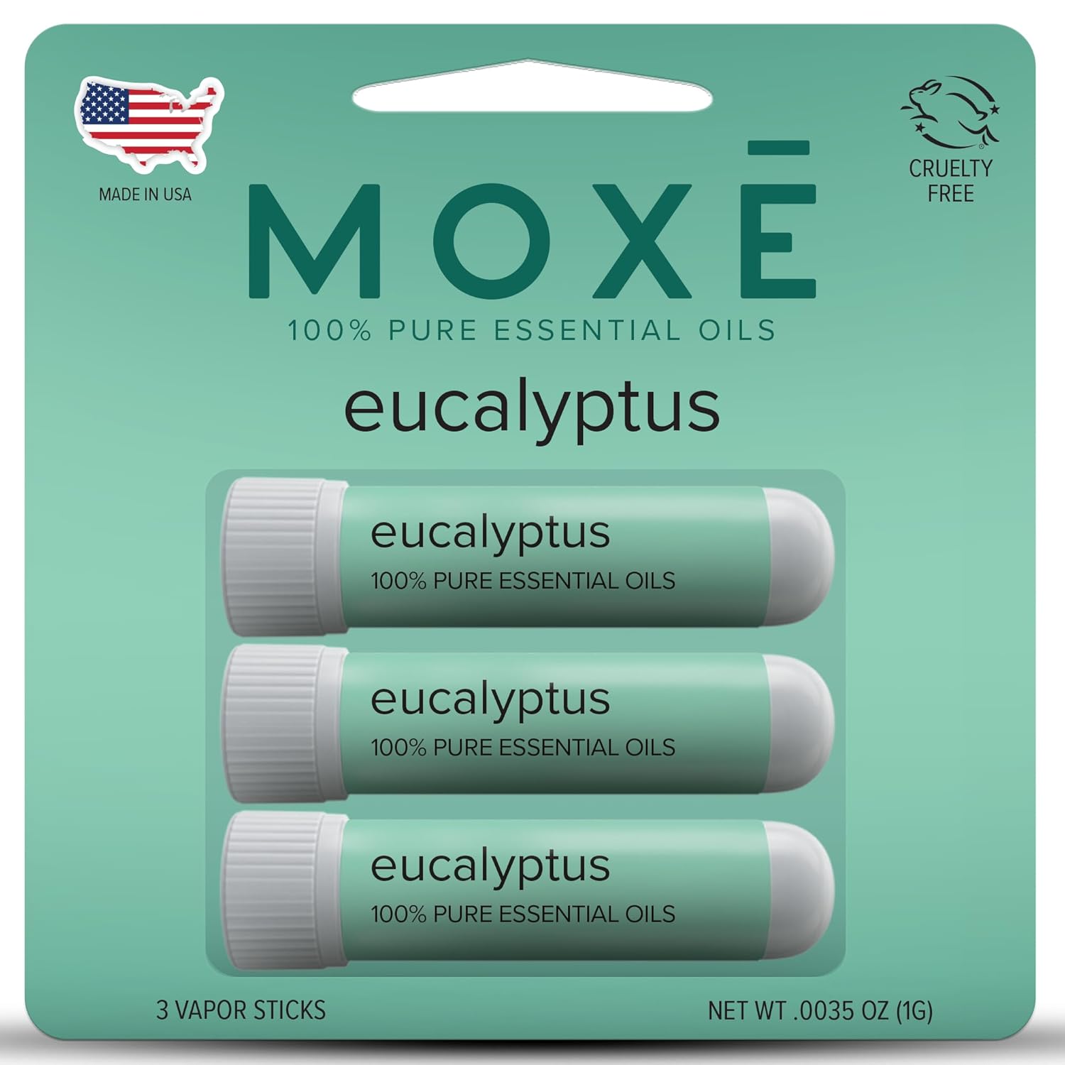 MOXĒ Eucalyptus Essential Oil Nasal Inhaler, Sinus & Congestion Relief, Daily Relaxation, Stress Relief, Therapeutic No-Mess Aromatherapy, Pure and Natural, Made in USA (3 Pack) packaging may vary