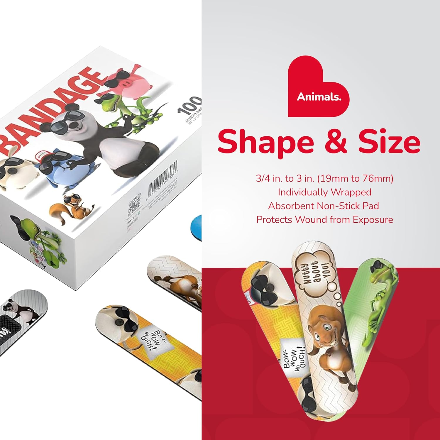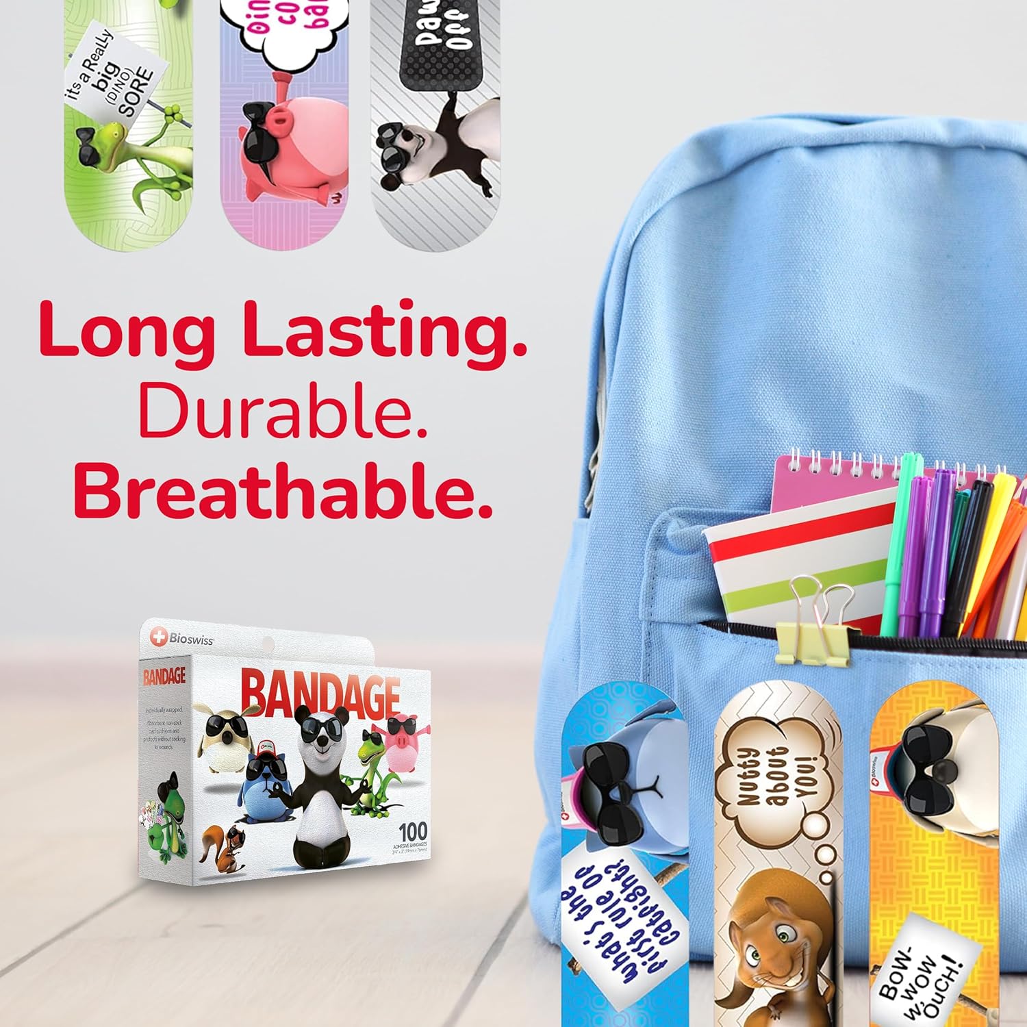 BioSwiss Kids Bandages, Assorted Animal Shaped Variety Self Adhesive Bandage, Latex Free, Sterile Wound Care, 100 Count
