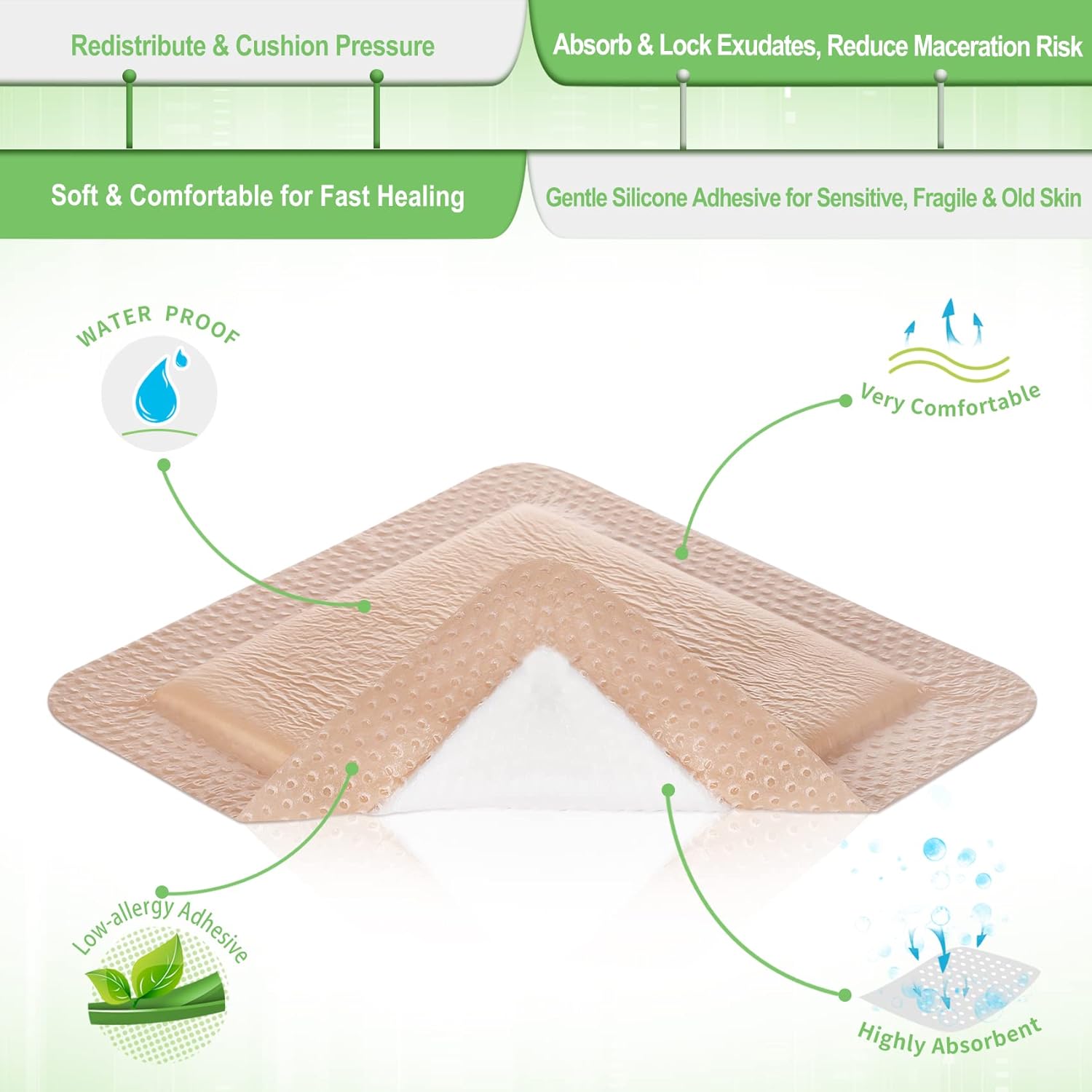 NeuHeils Silicone Adhesive Foam Dressing Bandage with Gentle Border 6 x 6 inch for Bed Sore Leg Ulcer, 5 Pack, High Absorbency Waterproof Silicone Wound Bandage for Pressure Ulcer