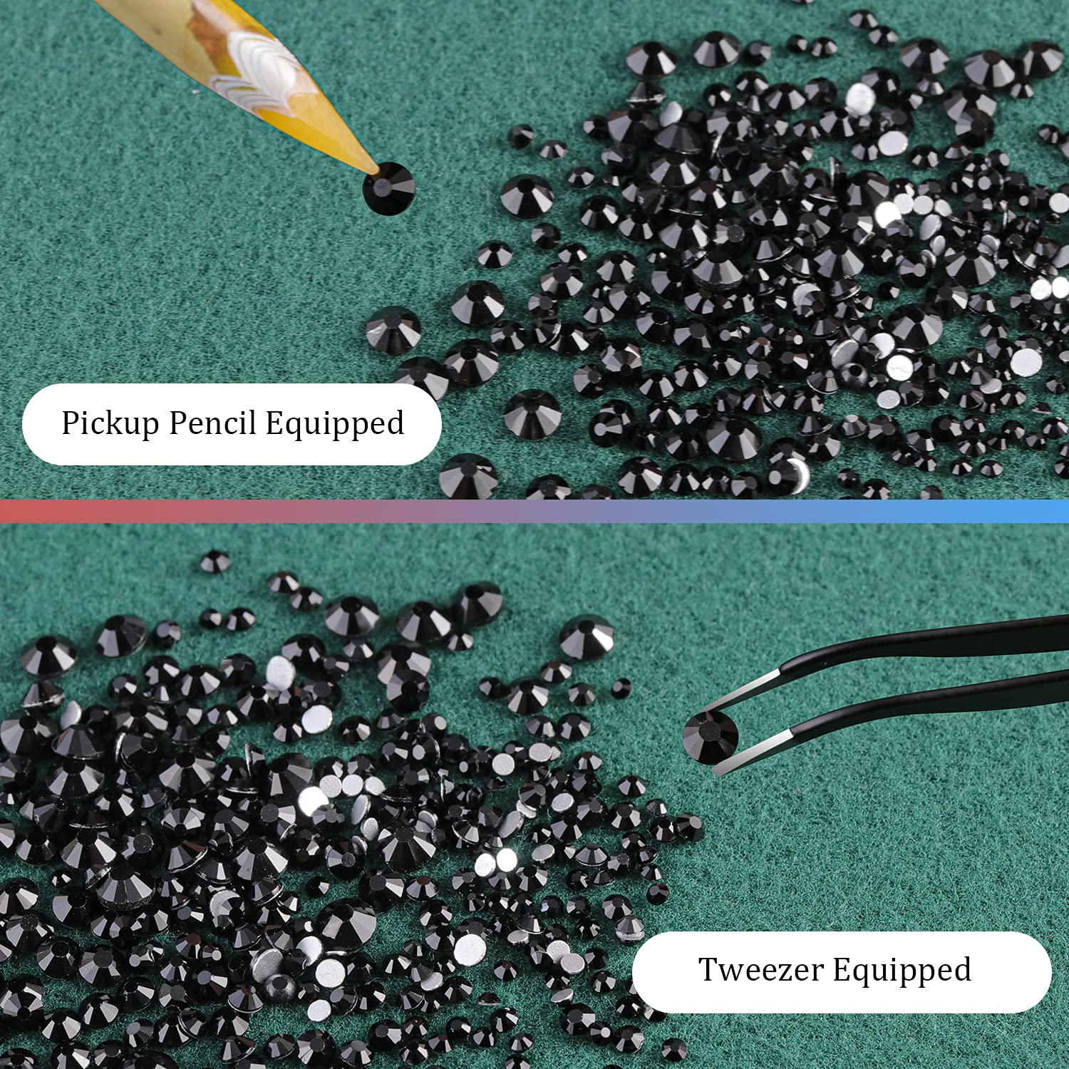 6 Sizes Black Glass Crystal Kit with Pickup Pen + Tweezer Tools for Shine Nail Art Manicure Makeup DIY Decoration Flatback Round Rhinestone Gem Jewelry Diamond