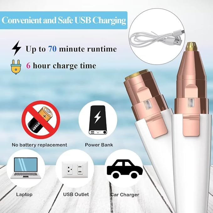 - 【USB RECHARGEABLE & LED LIGHT】- 2 in 1 electric eyebrow razor coming with a USB cable, you can charge it with power bank, socket and PC. Fully charged in 6 hours, you can enjoy 70 minutes cordless shaving! Electric eyebrow shaver with built in bright LED light provides blind spot of vision, ensuring that any peachy fluff is not missed.