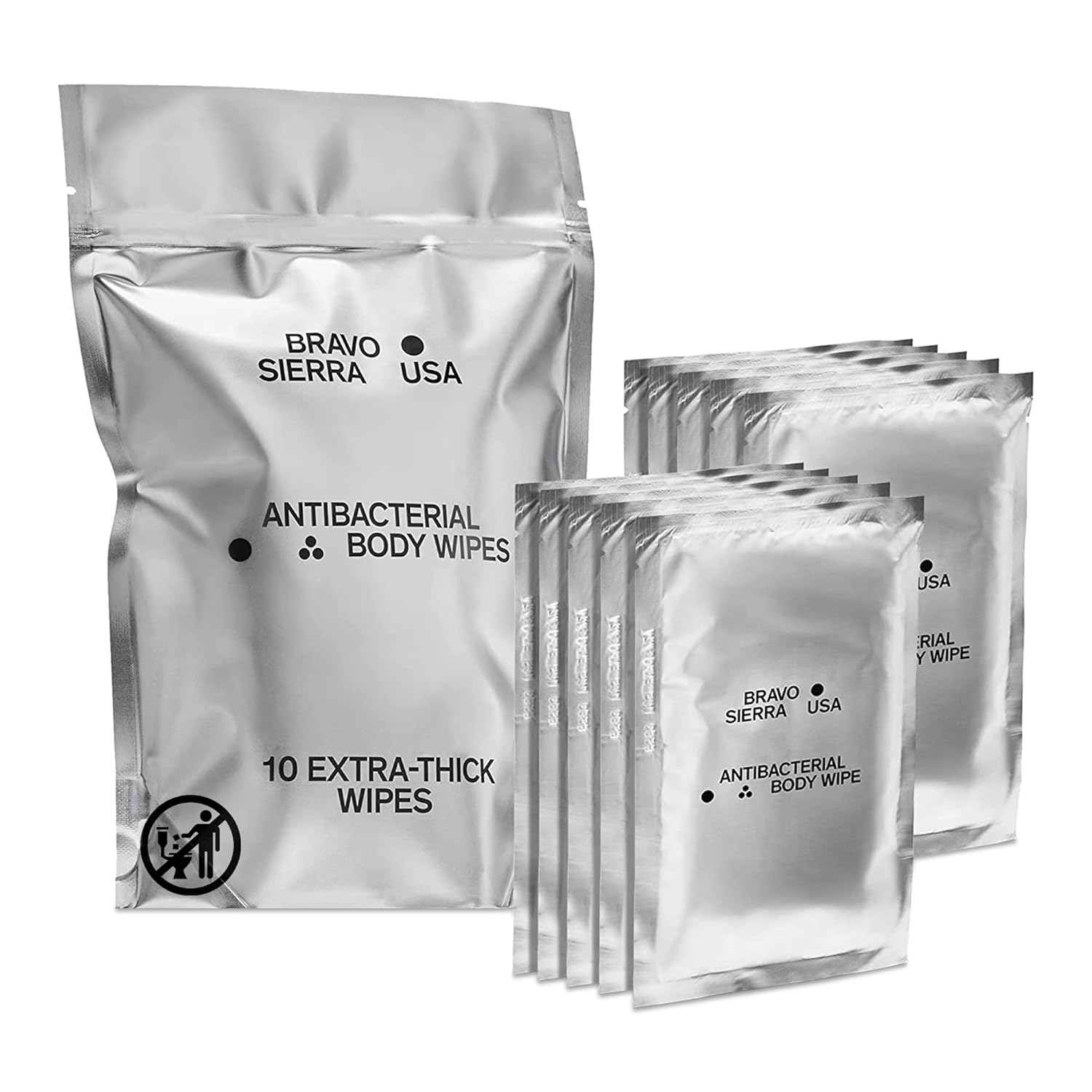- The Tactical Shower: Whether you’re on a camping trip, finishing up a workout or travel, Bravo Sierra Body Wipes help you take care of sweat and grime with just a few swipes. Includes 10 wipes.