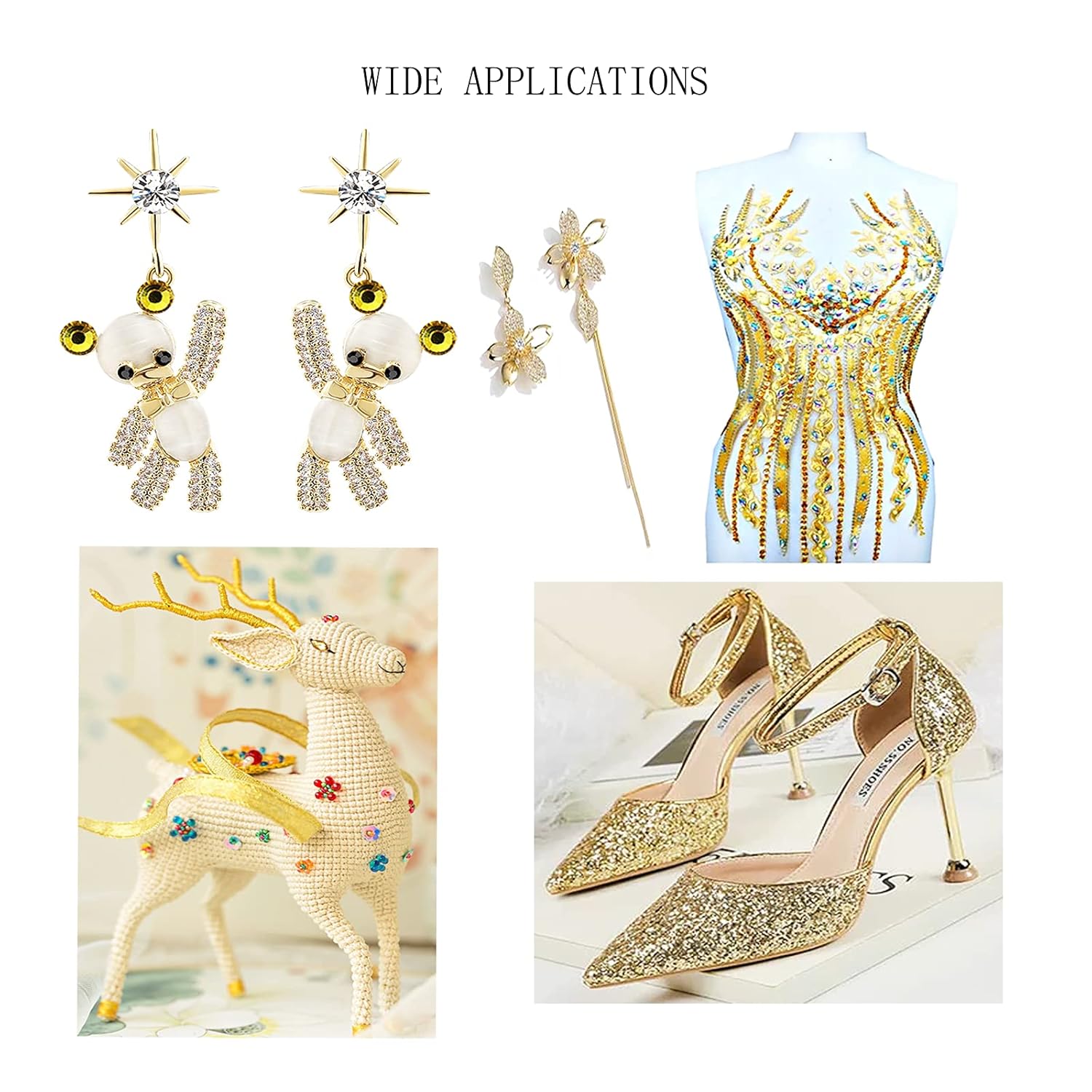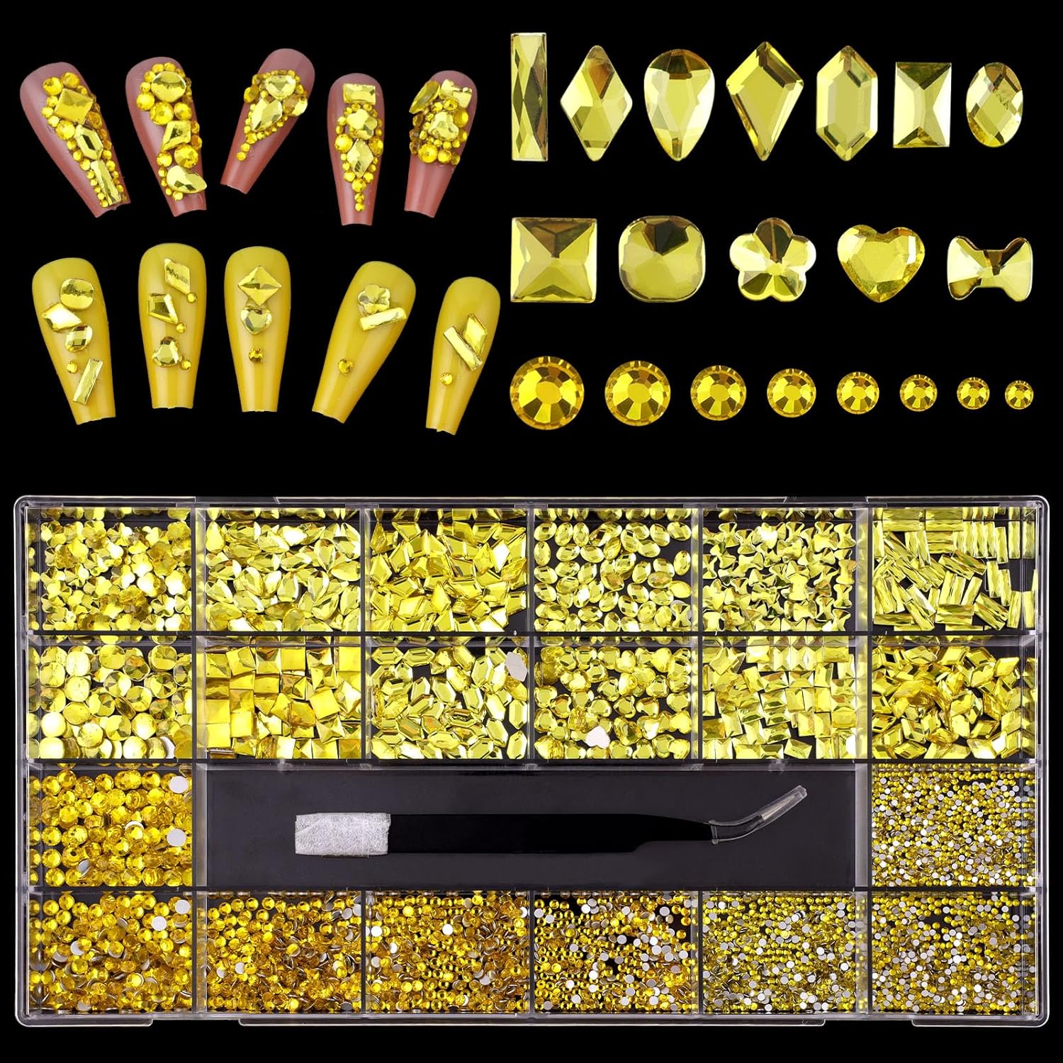 - 【Gold Rhinestones for Nails】The nail crystal kit includes 2500 round flat rhinestones of 8 kinds and 600 lemon yellow special-shaped diamonds of 12 kinds in a transparent storage box, 1pcs nail rhinestones pen and 1pcs tweezers. Our 3D nail art rhinestones are available in different popular styles, which will add brilliance and charm to your craftsmanship and make your nails more dazzling and charming.