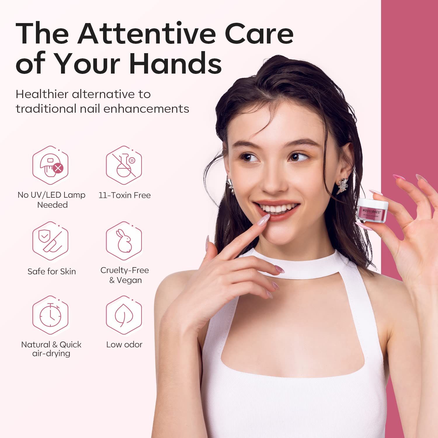 - 🌸【No Need Lamp & Easy To Use】Modelones acrylic nail powder system doesn't need a nail lamp to cure. Easy application and works with all of Modelones monomers and brush!Perfect for beginners and nail DIY lovers who enjoy making nail extensions, nail carving, french nails, 3D nail art design.