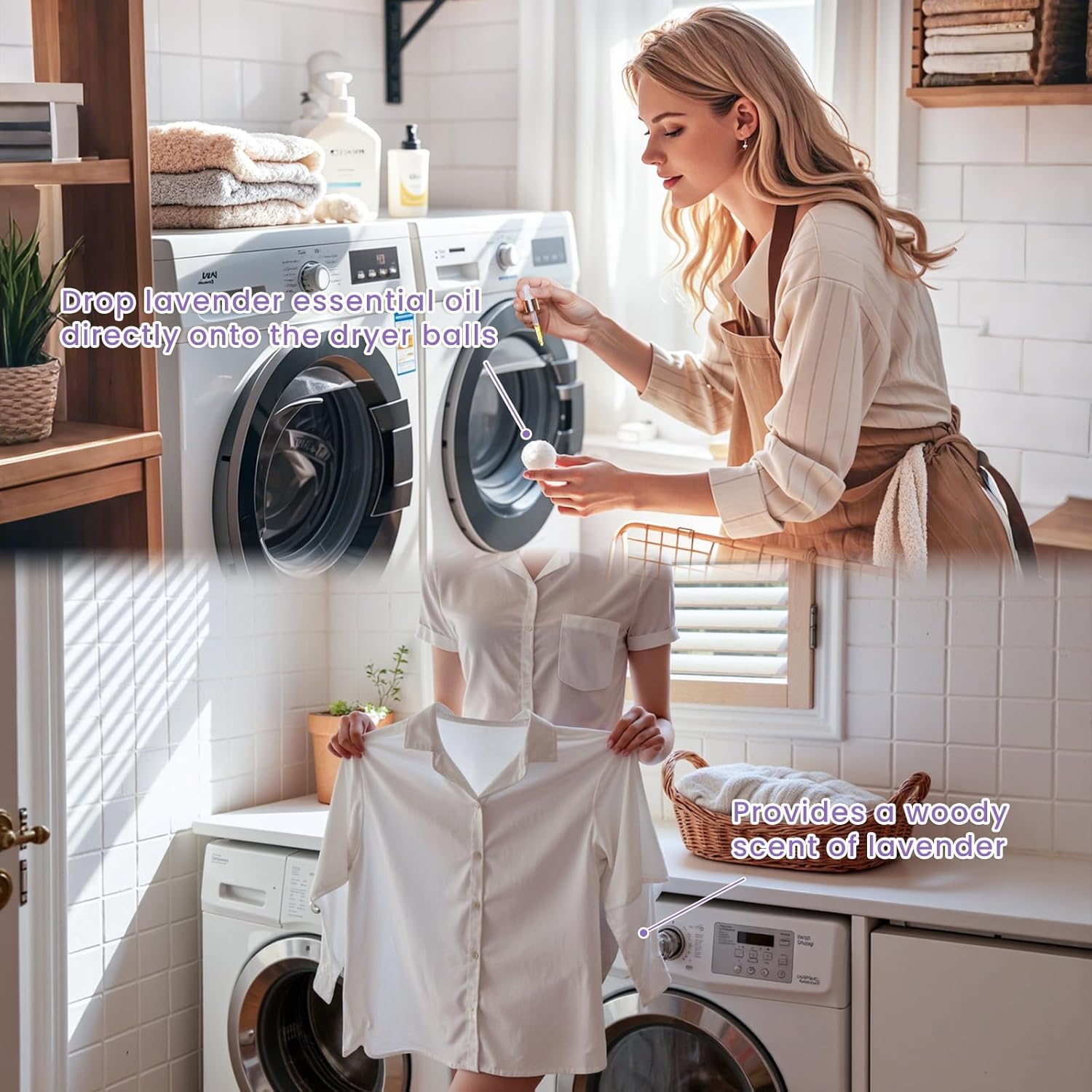 - Make Wool Drying Balls: Adding the right amount of lavender essential oil directly onto wool drying balls to make laundry fluffier, less wrinkled, and to add the herbal scent of lavender to your laundry