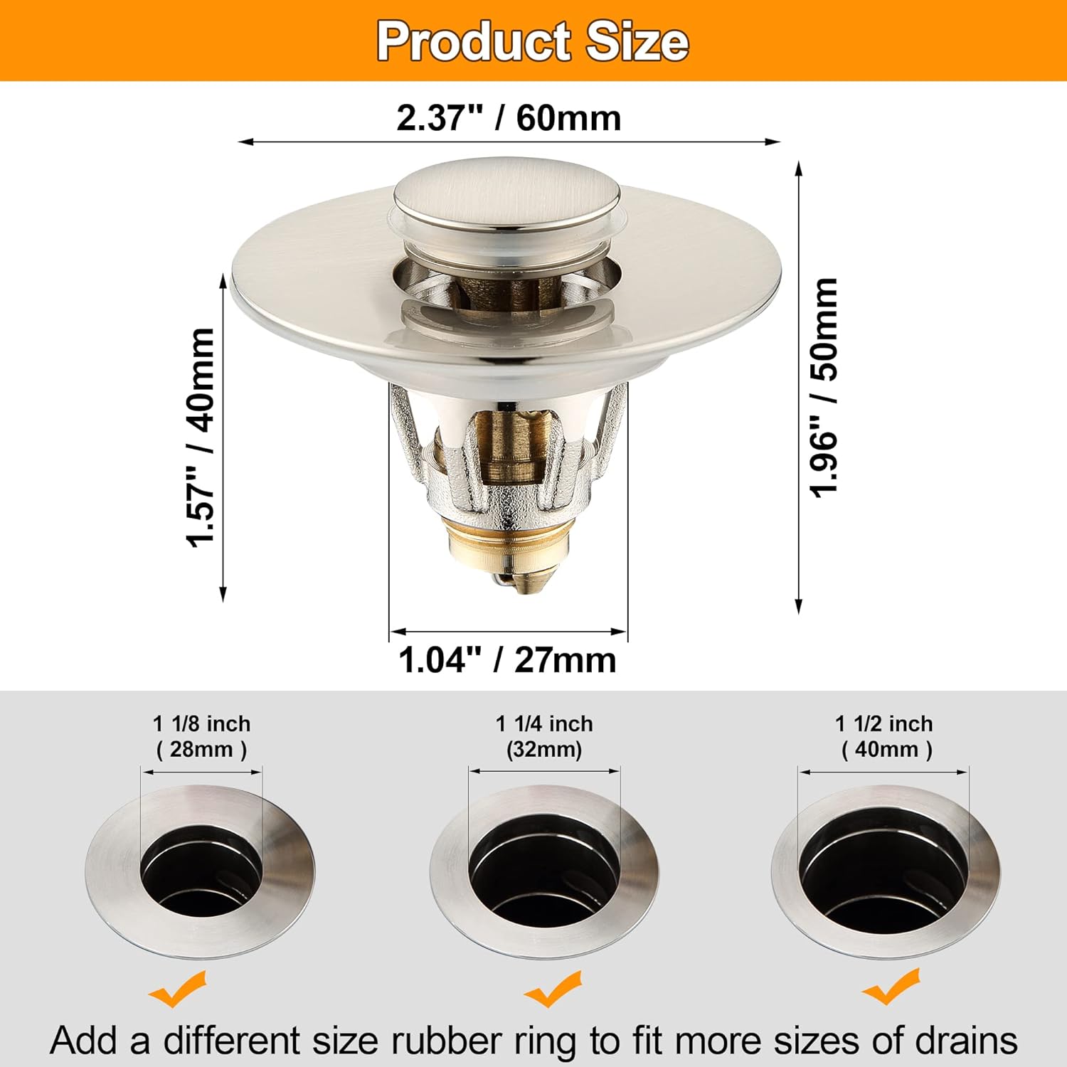 - Only Suitable for 1.125"- 1.25" Diameter Drains: Upgraded pop-up sink drain plug fits the hole dia size 1 1/8~1 1/4 inch(28~32mm); We provide extra rubber rings; If it doesn't work after installation, please try another rings; Pls make sure your sink drain hole before purchasing