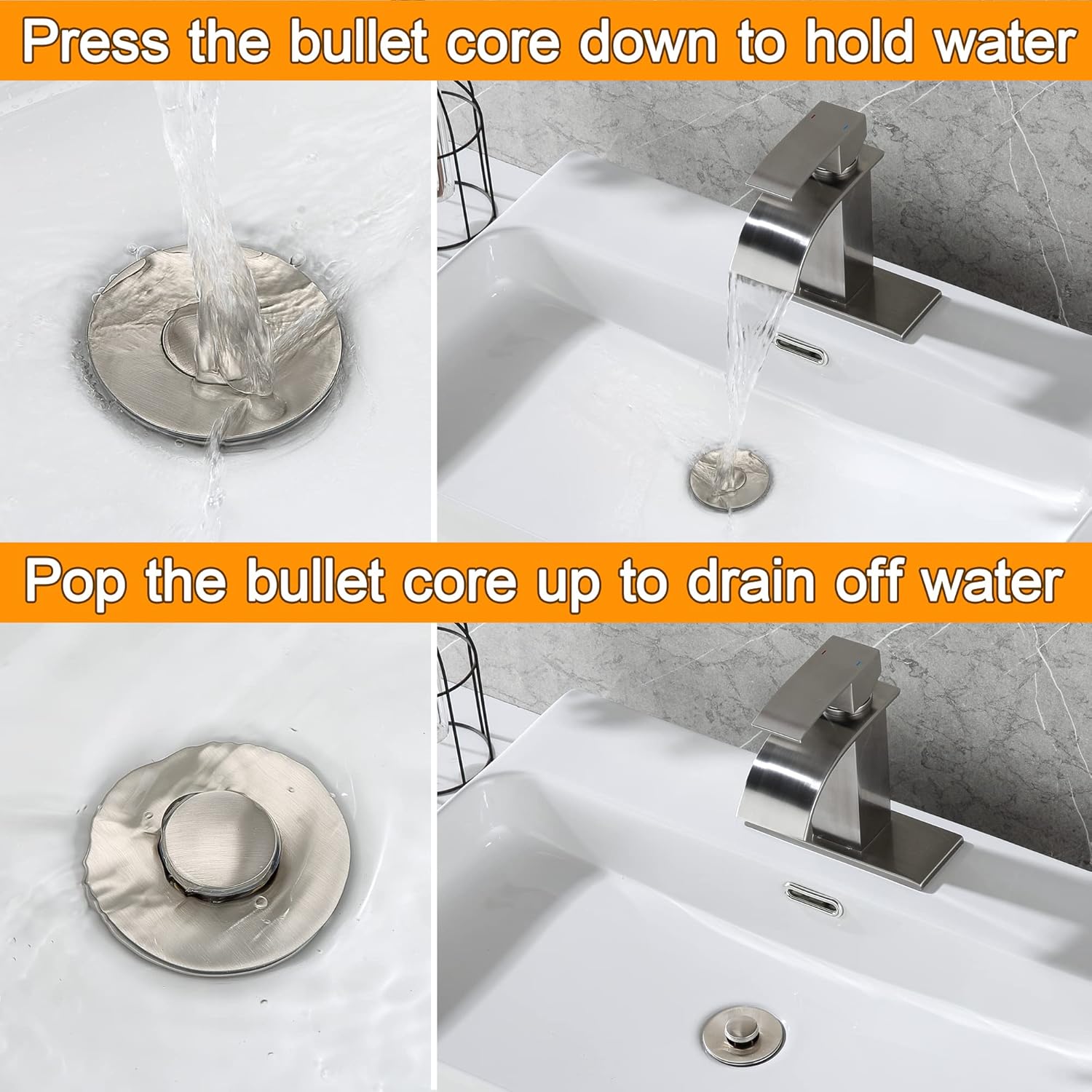 - Upgraded Pop up Bathroom Sink Stopper: The bathroom sink drain filter plug is made of high quality stainless steel and brass; Quickly seal and drain water with a single press; No worry of rust, cracking, corrosion or leakage