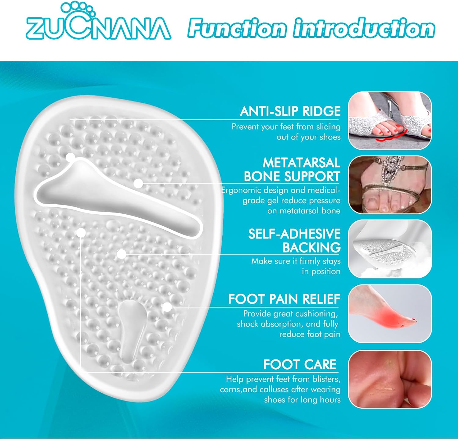 - WEARING SHOES WITHOUT PAIN: ZUCNANA ball-of-foot cushions are made by premium and soft gel. No matter you work, dance, or go shopping in heels, these metatarsal pads provide great cushioning and shock absorption, and help relieve foot pain