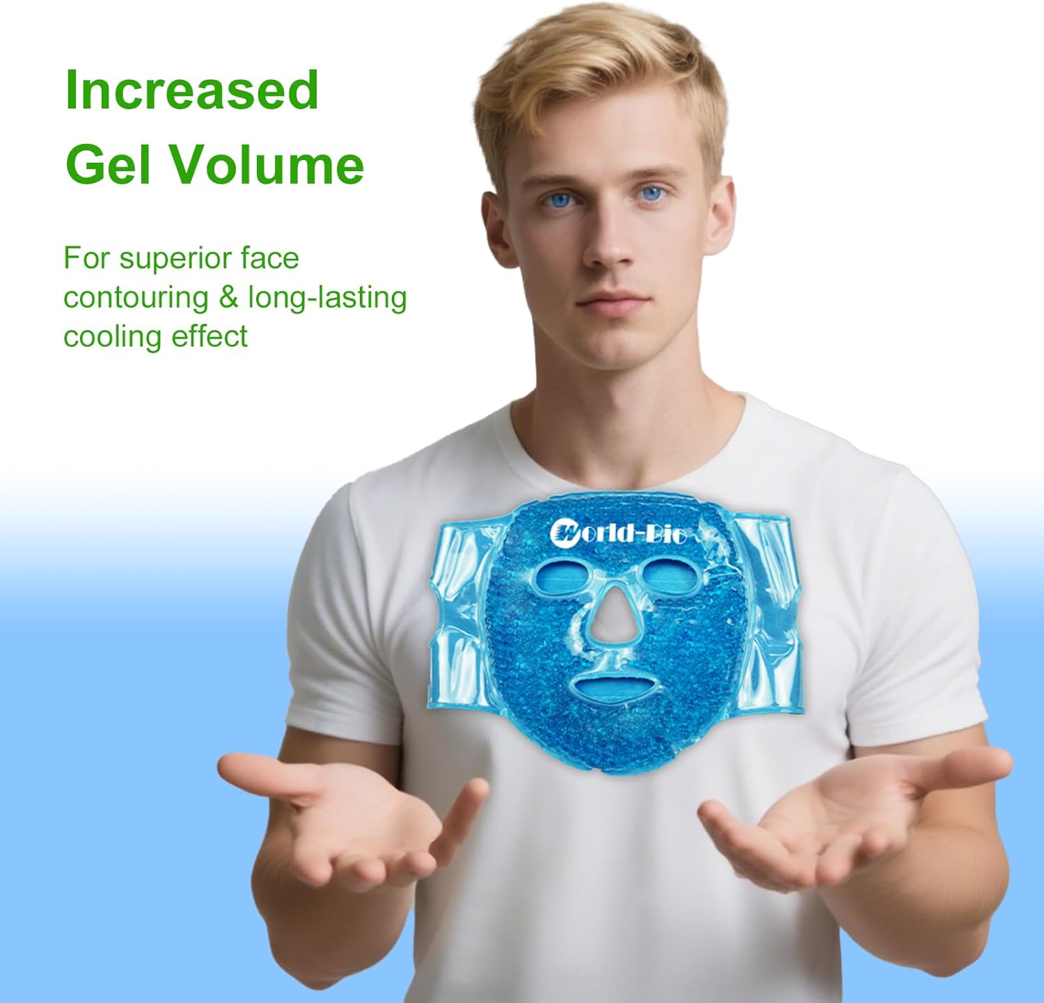 WORLD-BIO Reusable Ice Face Mask & Cooling Eye Mask - Cold Therapy Gel Pack for Puffy Eyes, Dark Circles Relief, Headache & Migraine Soothing - 3 Pcs Set with Adjustable Strap & Freezable Gel